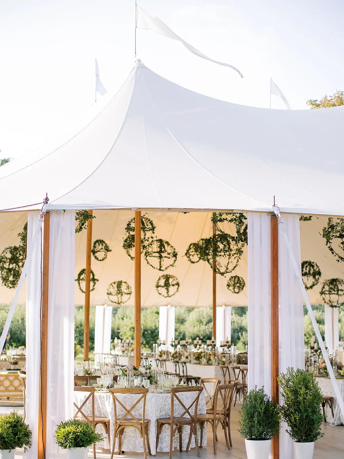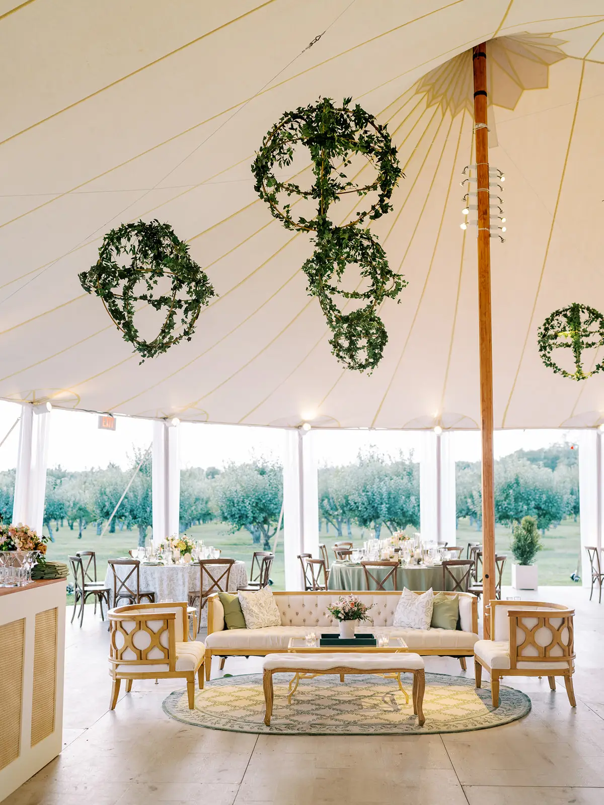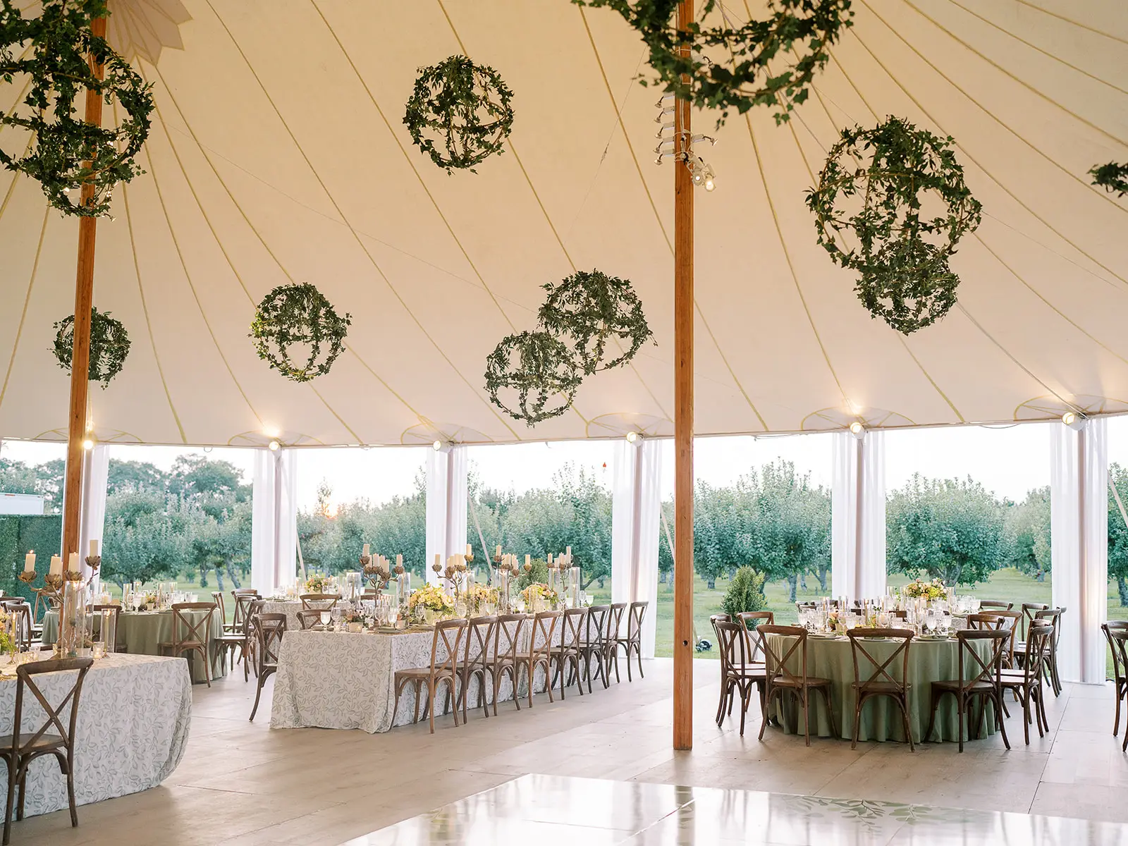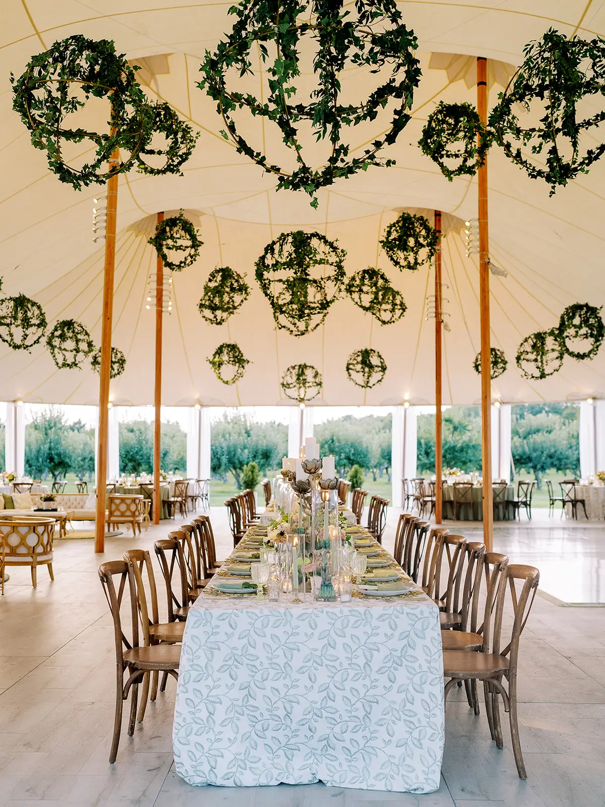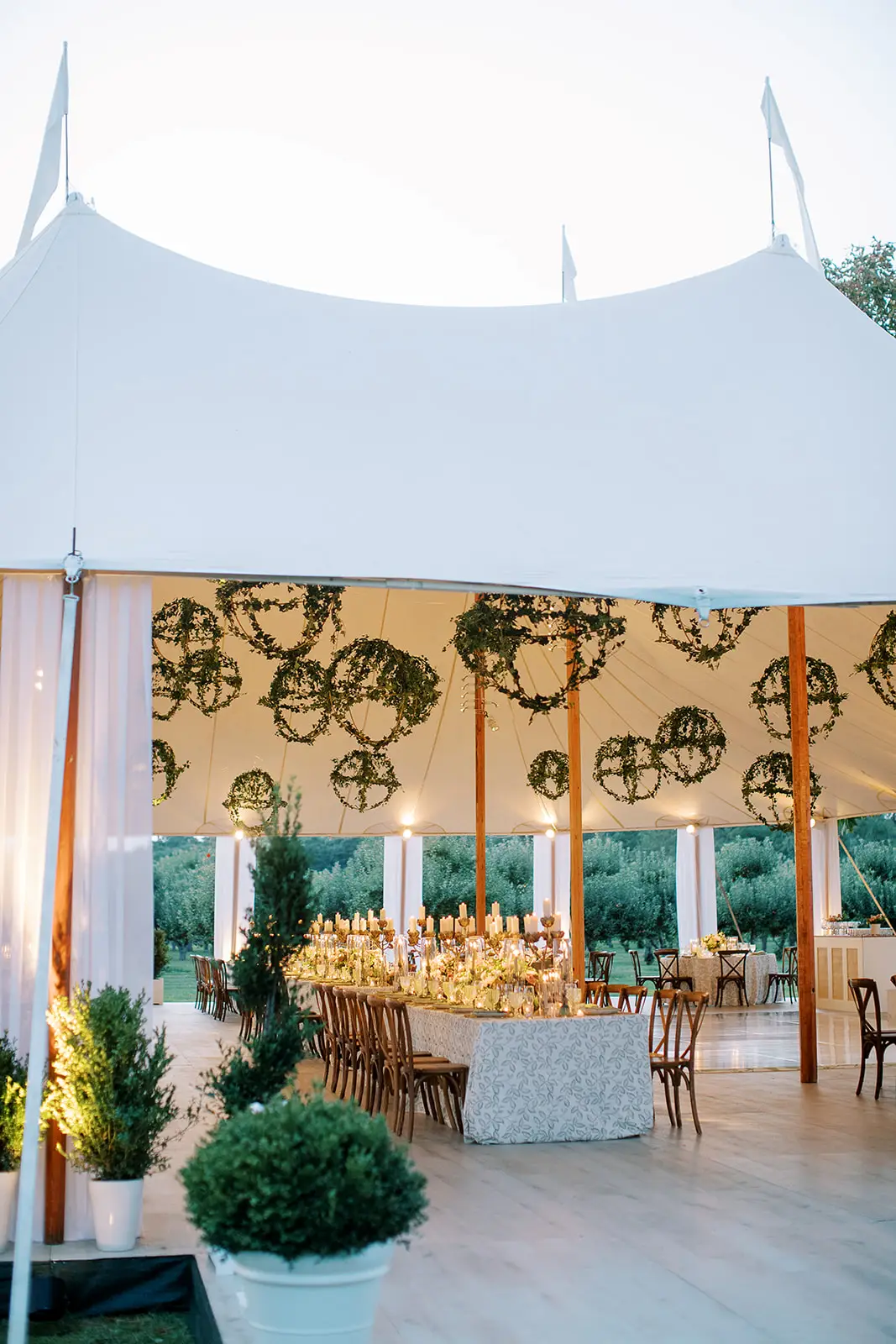 To foster a cozier atmosphere within our Sperry Sailcloth Tent, the vendor team incorporated hanging greenery-adorned orbs. This addition was aimed at directing guests’ attention beyond the reception tables, creating a more intimate ambiance.