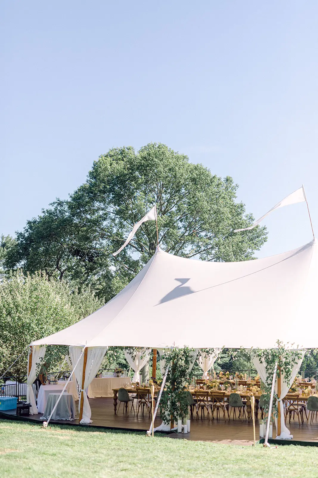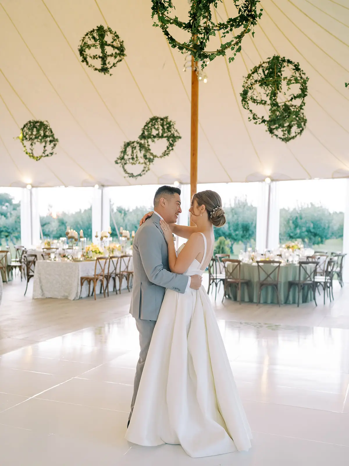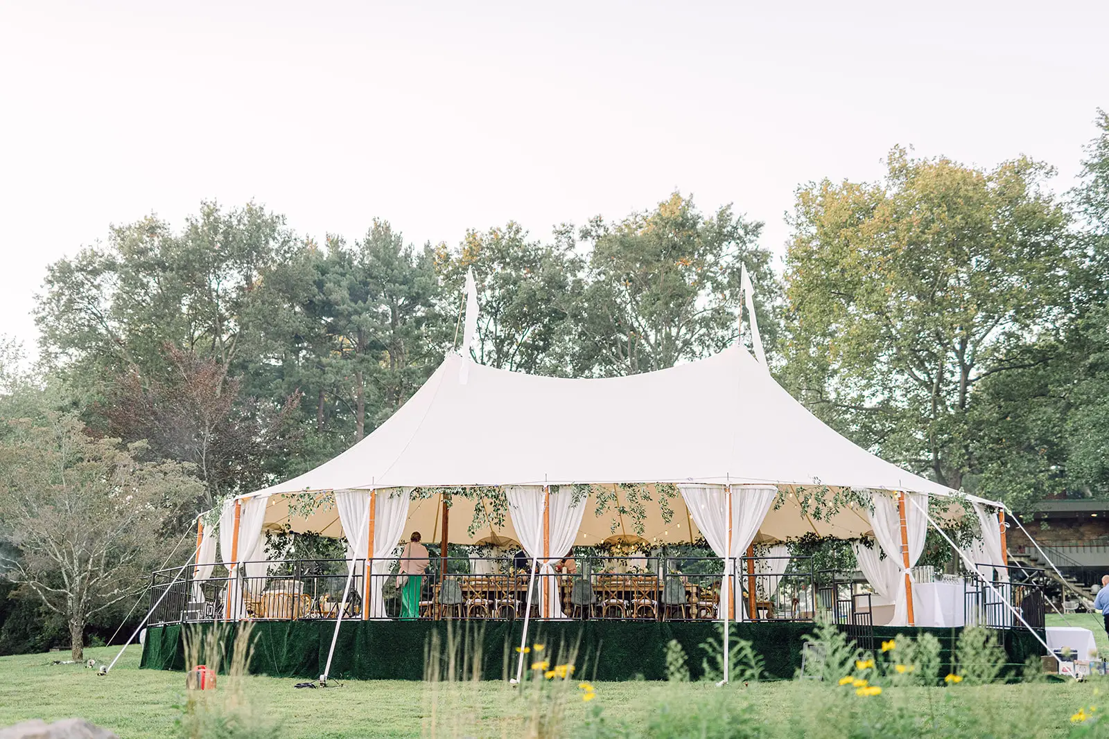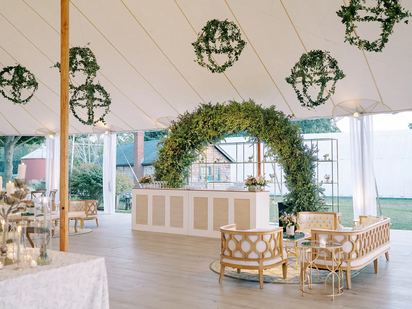 To foster a cozier atmosphere within our Sperry Sailcloth Tent, the vendor team incorporated hanging greenery-adorned orbs. This addition was aimed at directing guests’ attention beyond the reception tables, creating a more intimate ambiance.