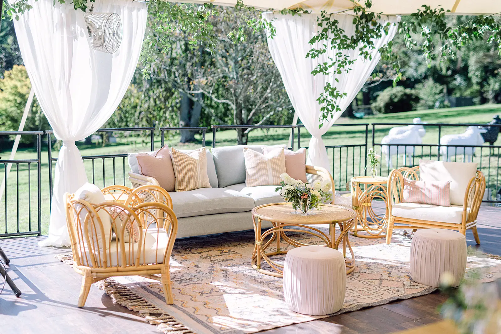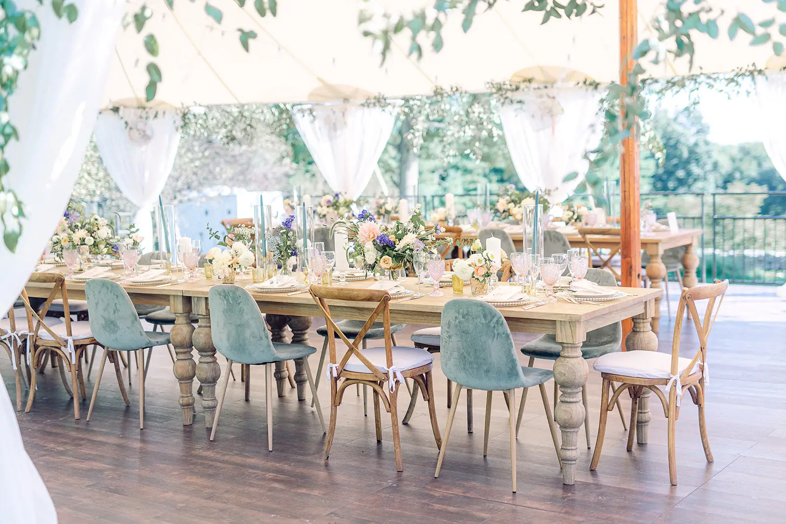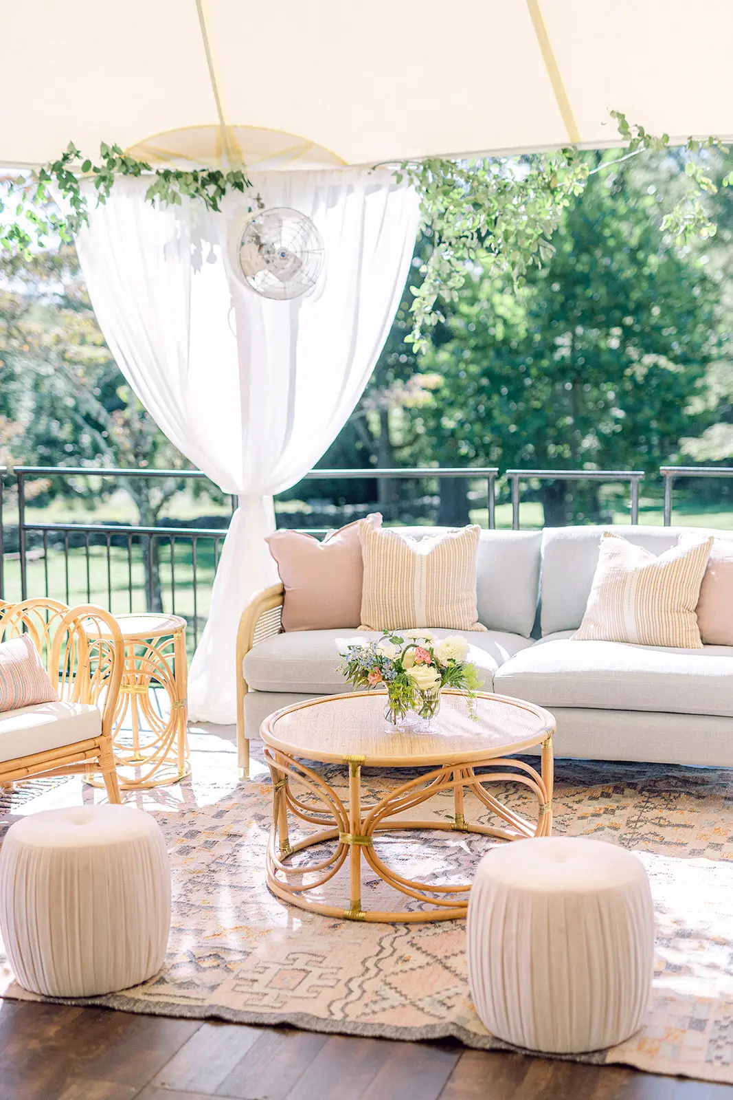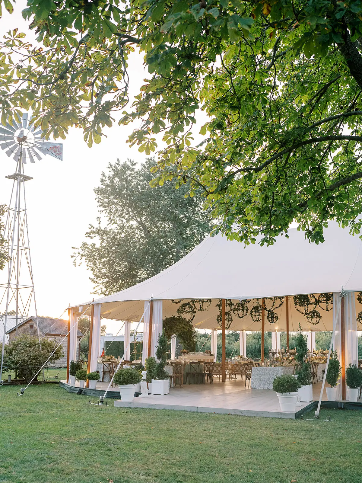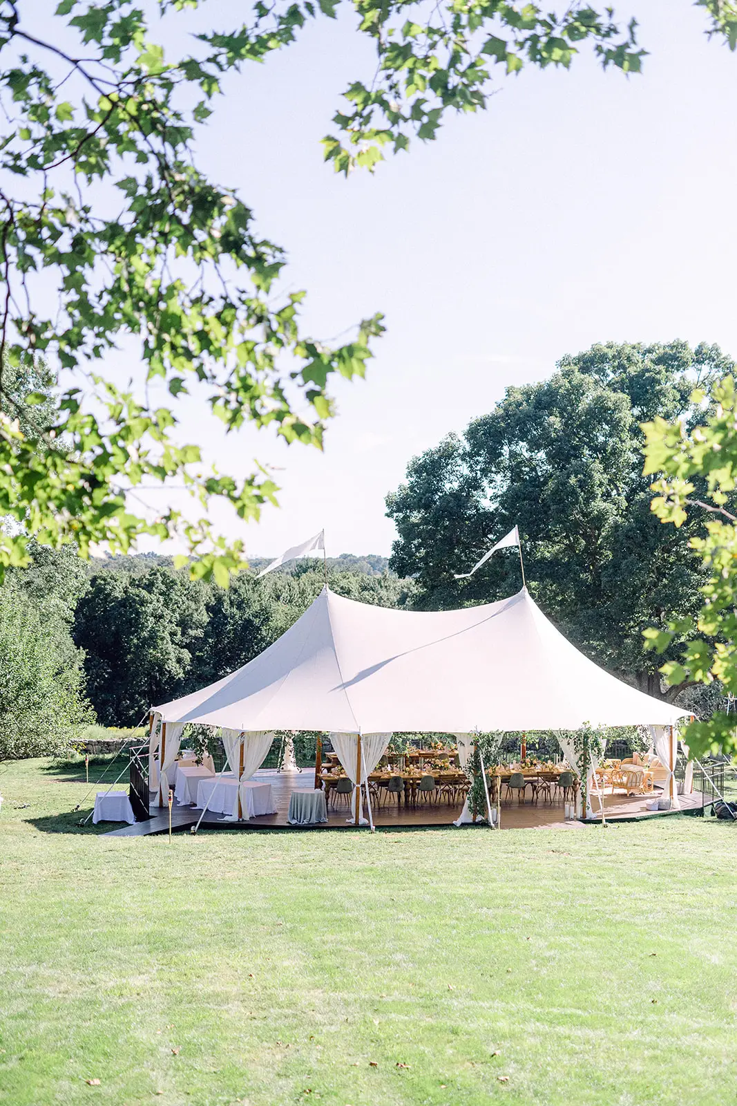 To foster a cozier atmosphere within our Sperry Sailcloth Tent, the vendor team incorporated hanging greenery-adorned orbs. This addition was aimed at directing guests’ attention beyond the reception tables, creating a more intimate ambiance.