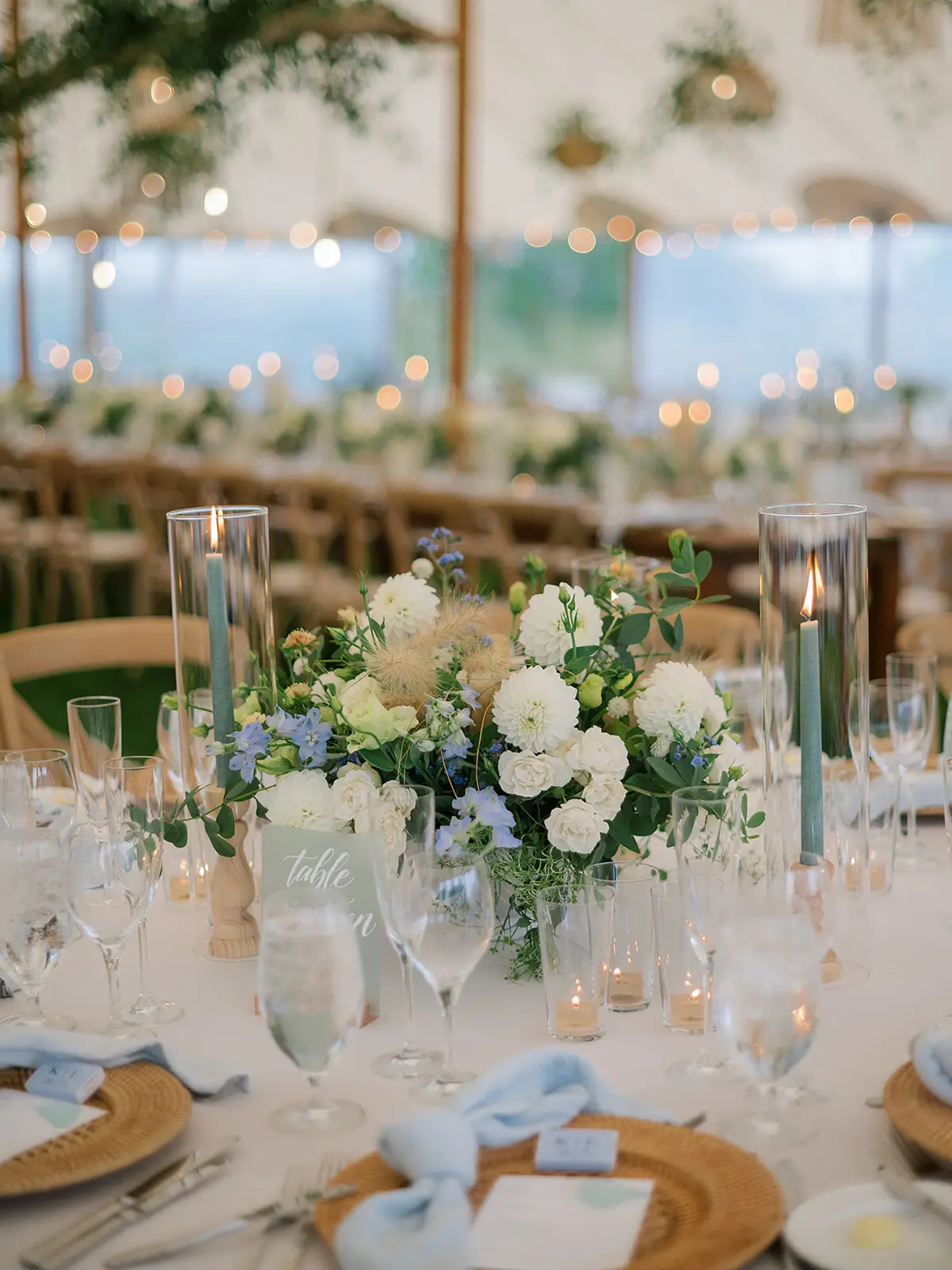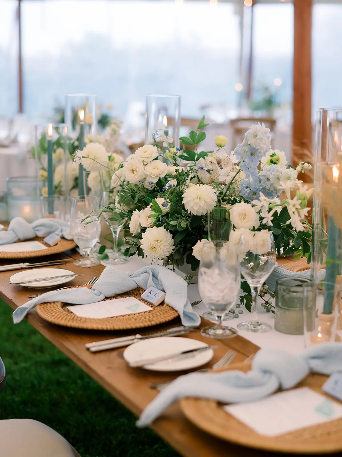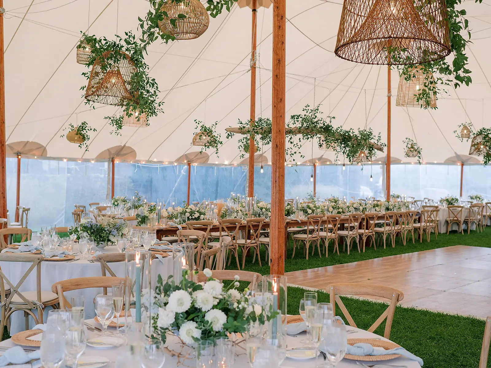 The tablescapes are adorned with natural wood surfaces, woven charger plates, and airy blue napkins. Fresh white and blue floral arrangements accented with lush greenery beautifully complement the surroundings, while suspended wooden beams draped in cascading foliage add a touch of whimsy to the overhead decor.