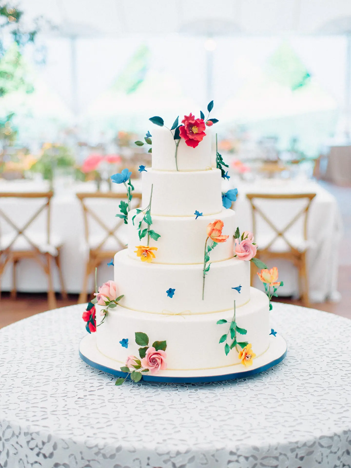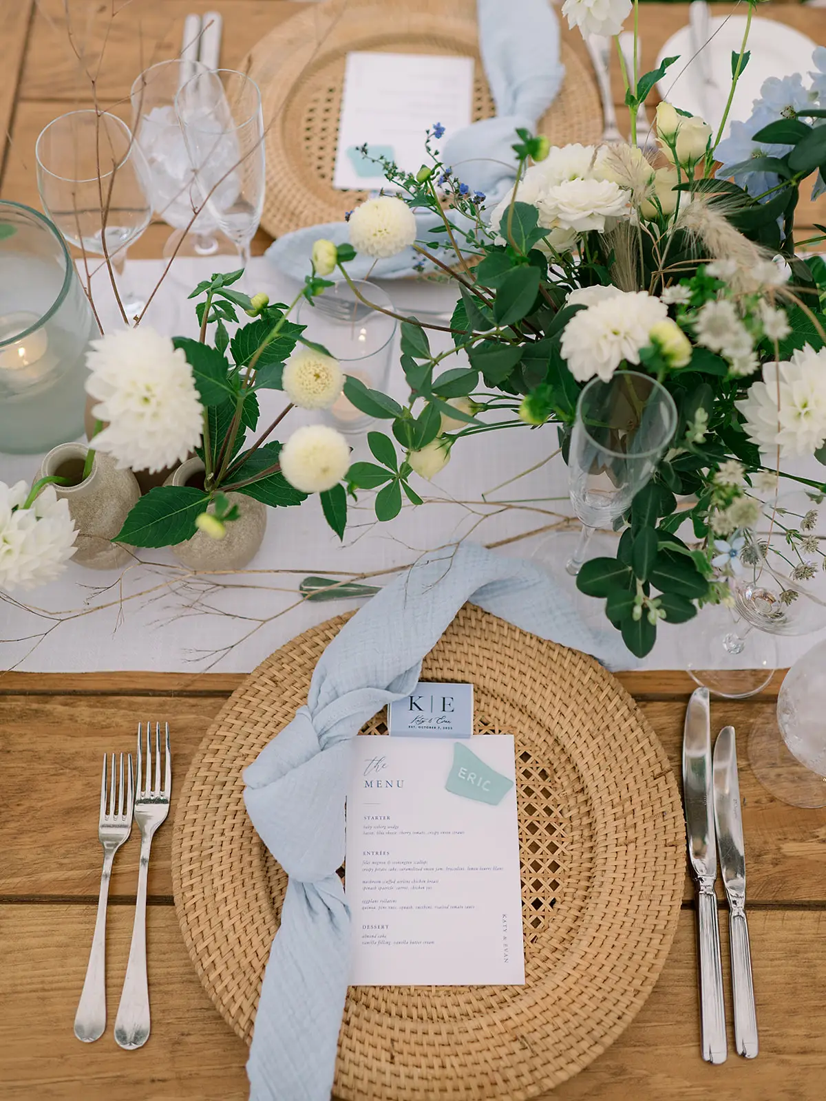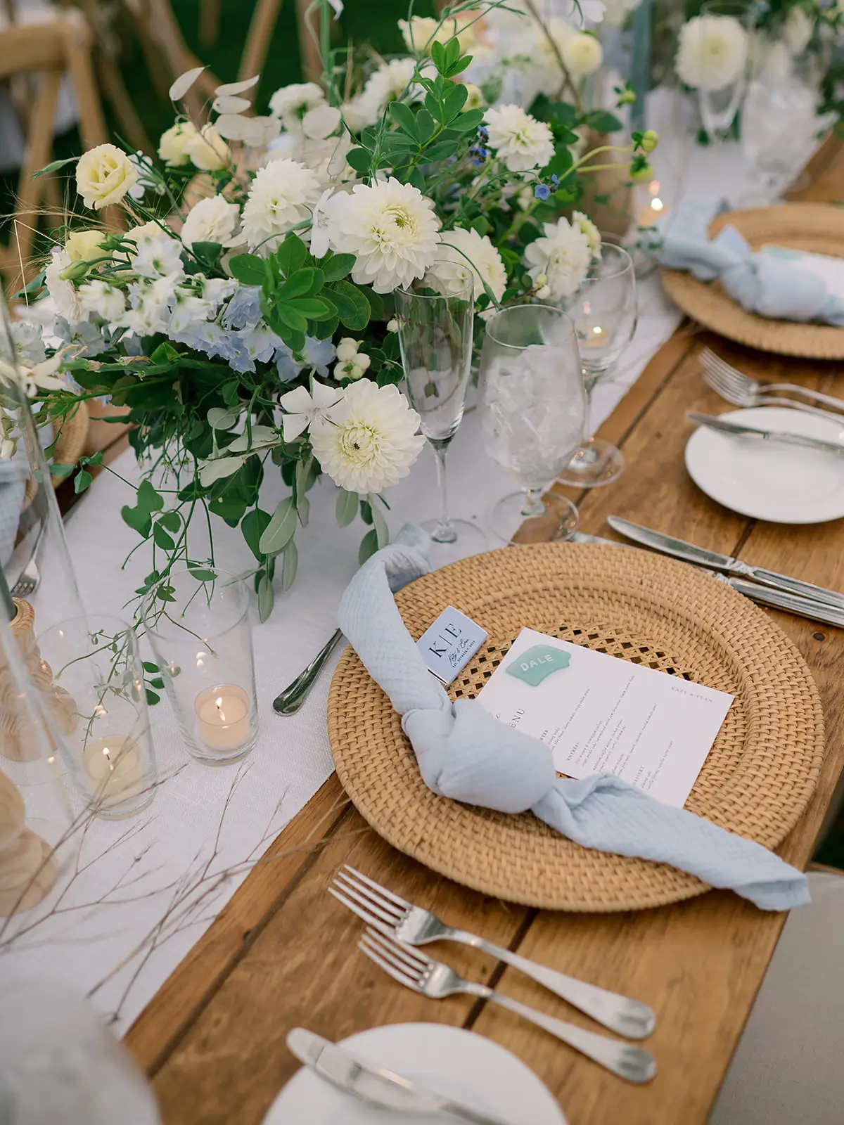 The tablescapes are adorned with natural wood surfaces, woven charger plates, and airy blue napkins. Fresh white and blue floral arrangements accented with lush greenery beautifully complement the surroundings, while suspended wooden beams draped in cascading foliage add a touch of whimsy to the overhead decor.