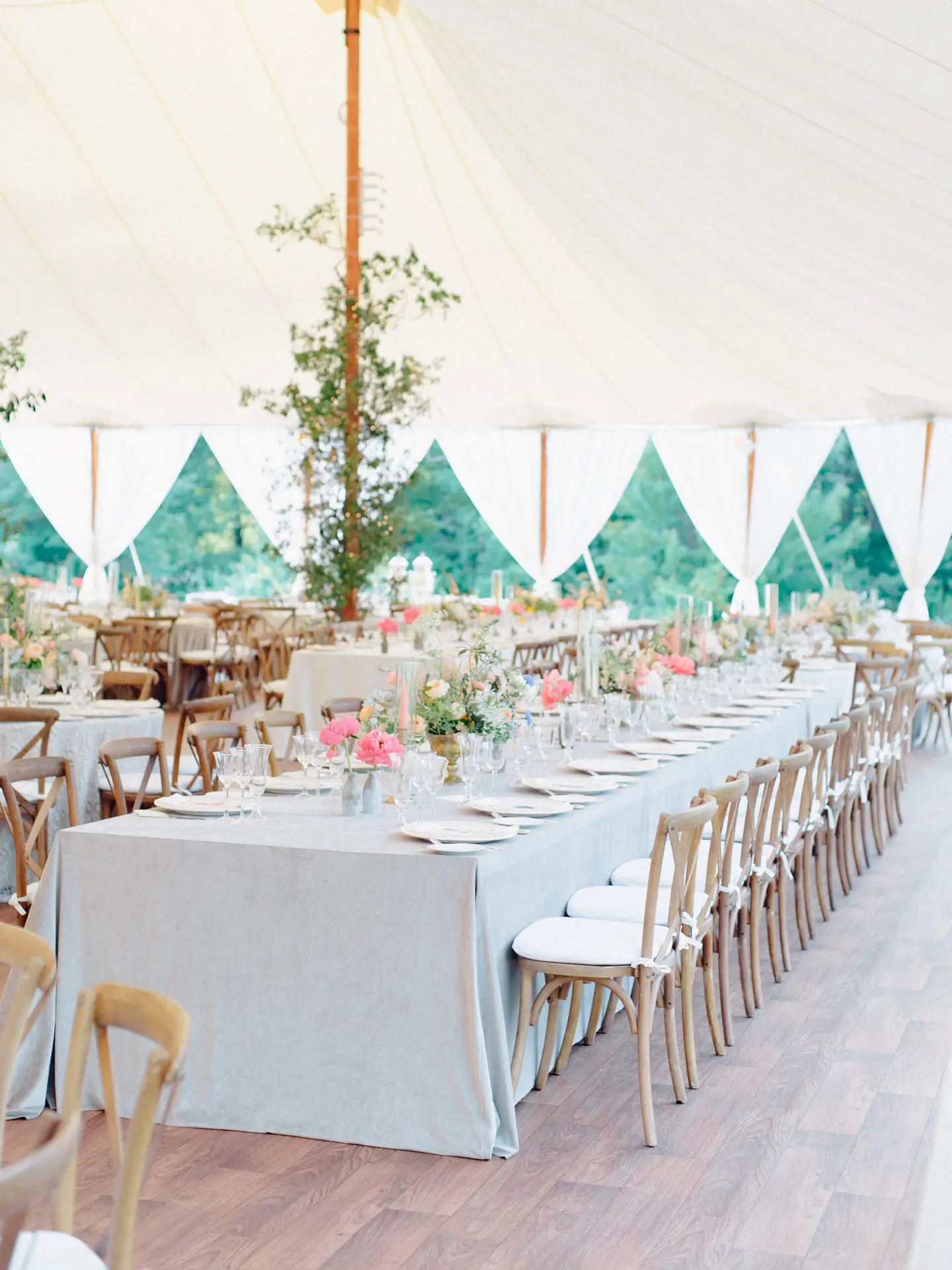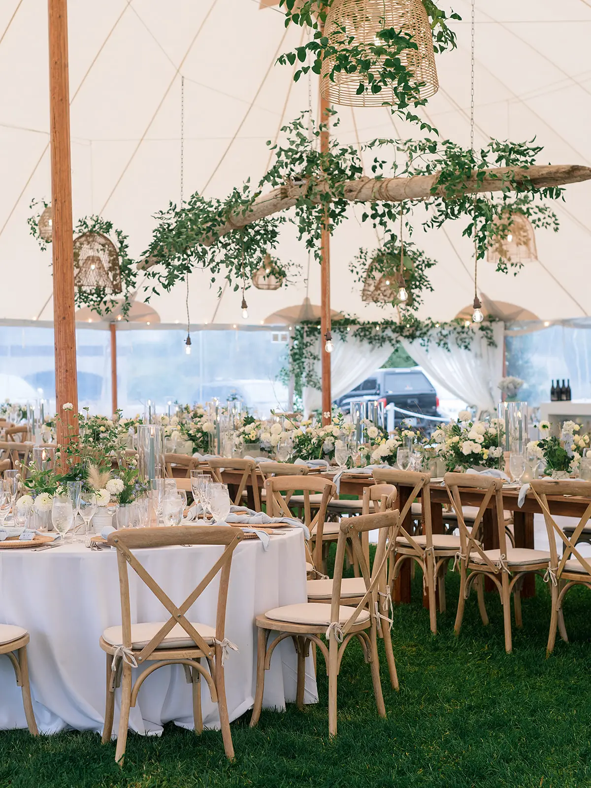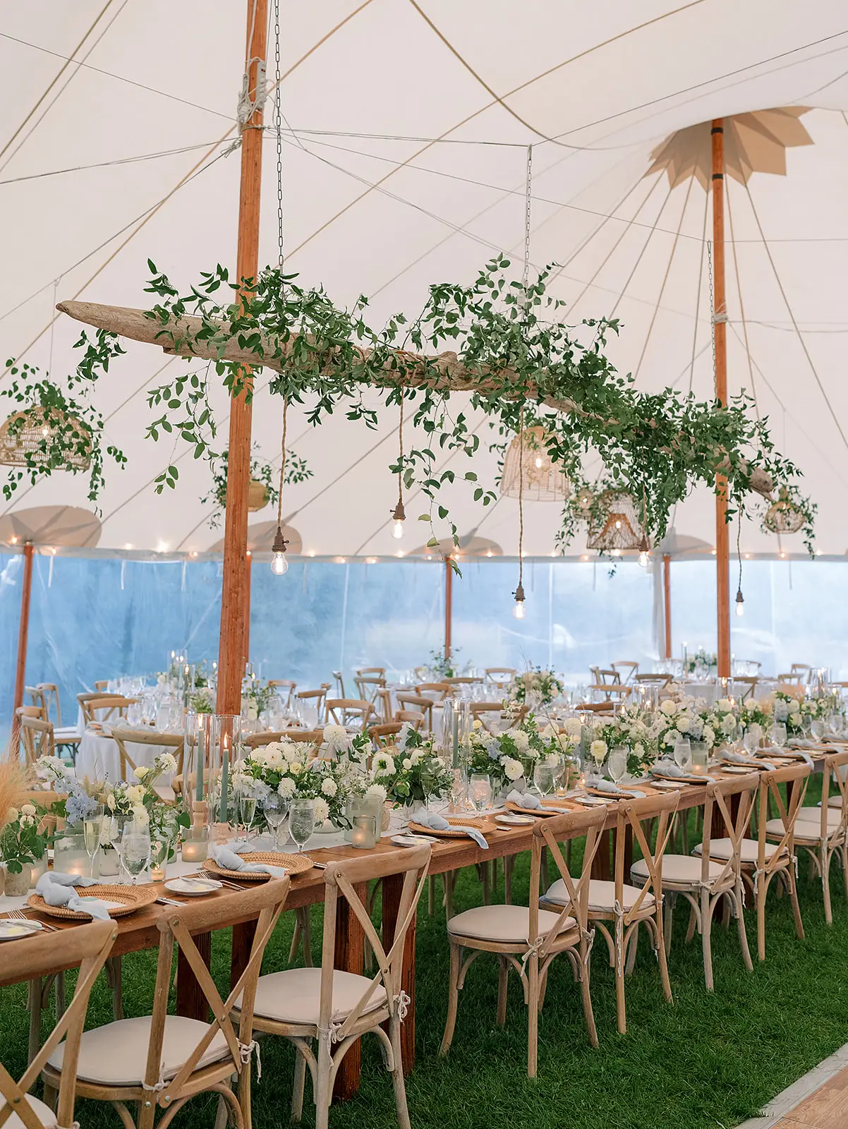 Ambient lighting from glass votives and hanging Edison bulbs make this celebration feel both intimate and enchanting under the iconic sailcloth canopy. It was a perfect blend of nature-inspired design and timeless sophistication!