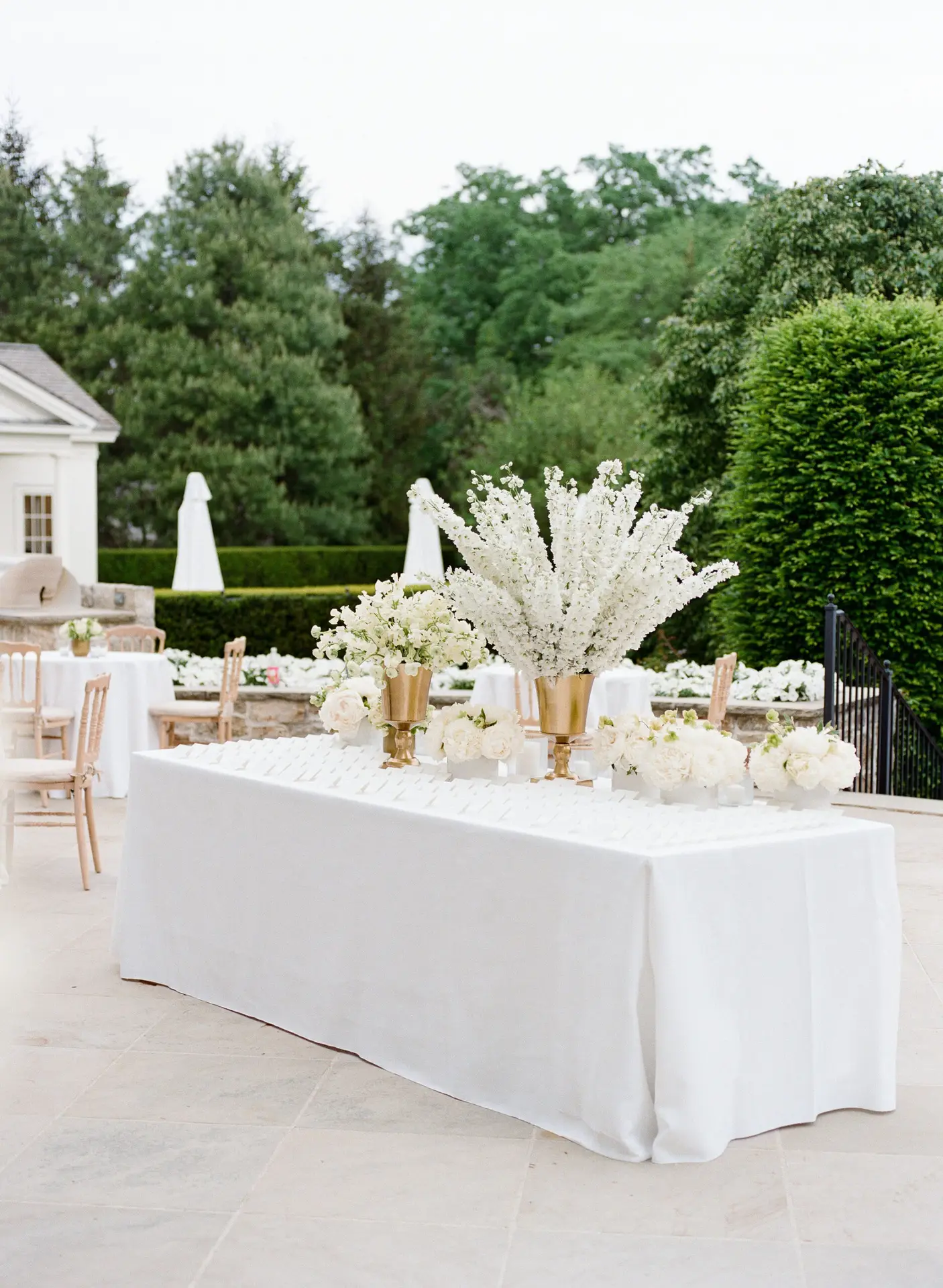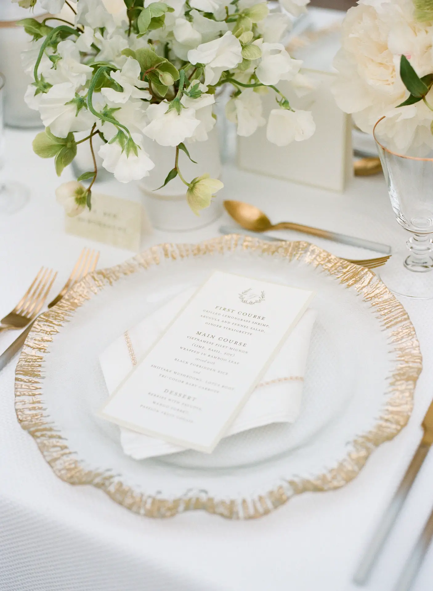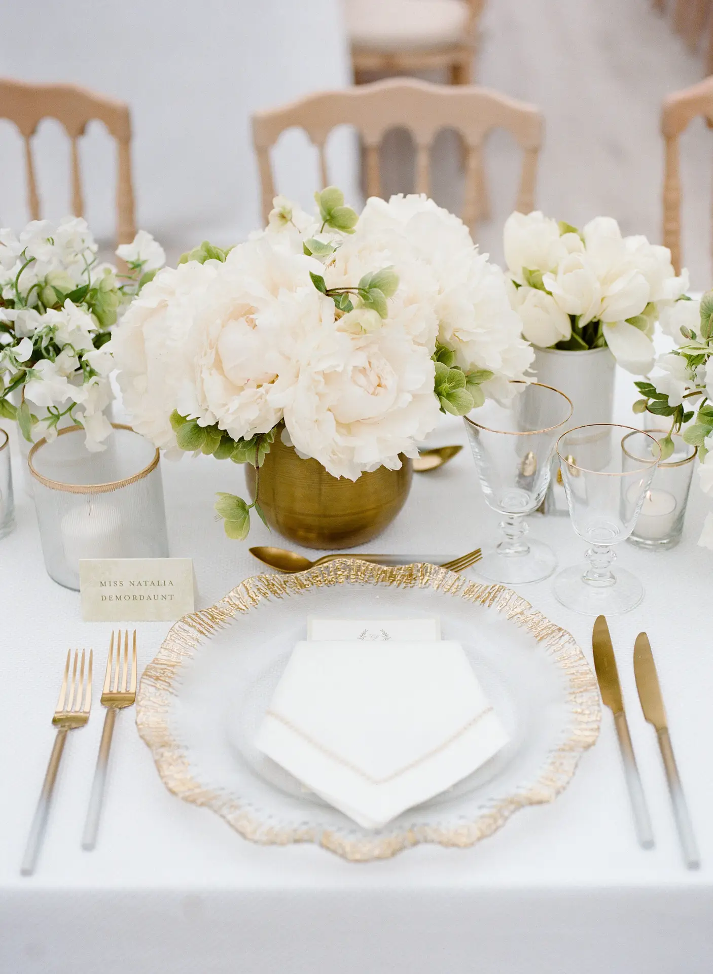 The tablescape décor was understated yet deliberate, featuring small bouquets of white florals interspersed with gold tableware and candles, adding an elegant touch to the overall aesthetic.