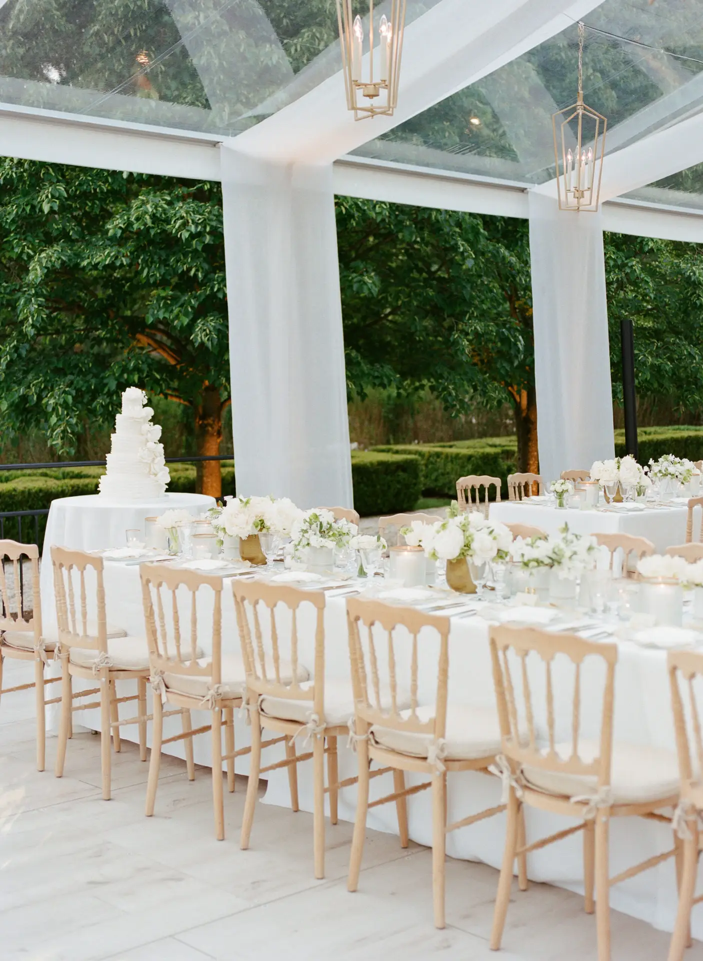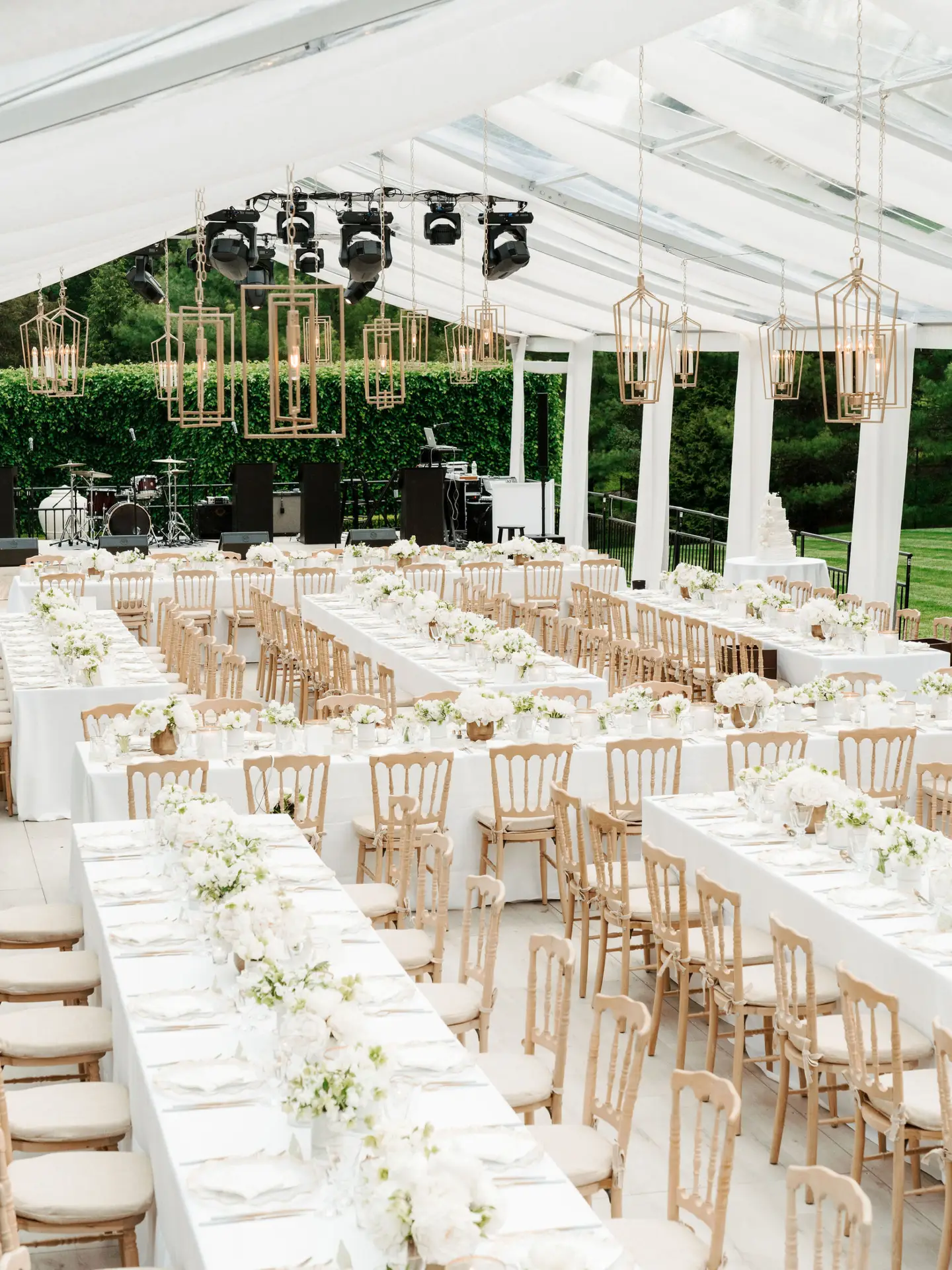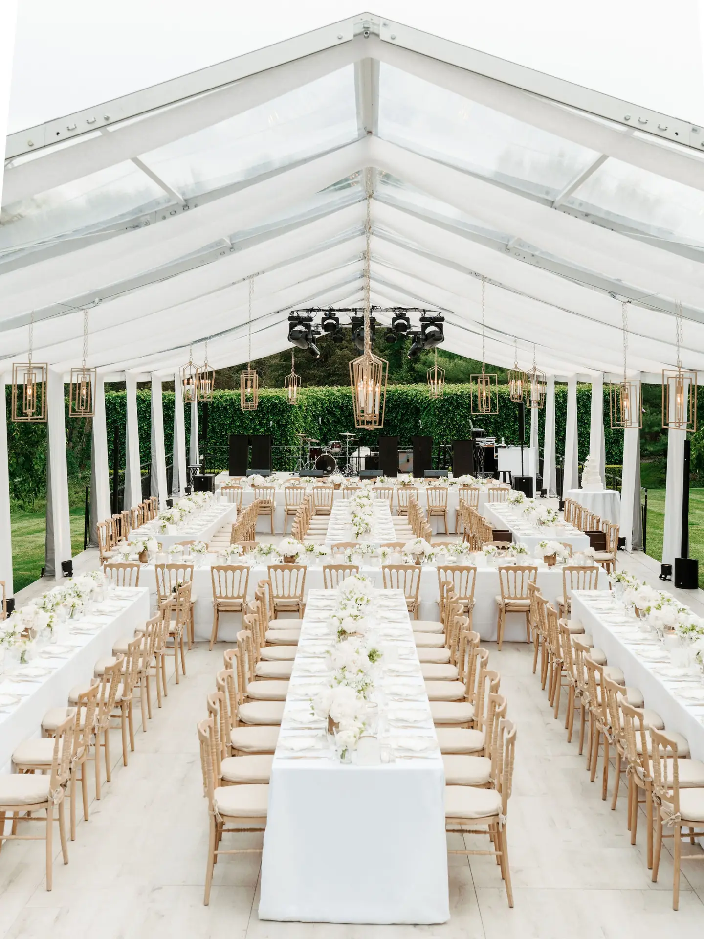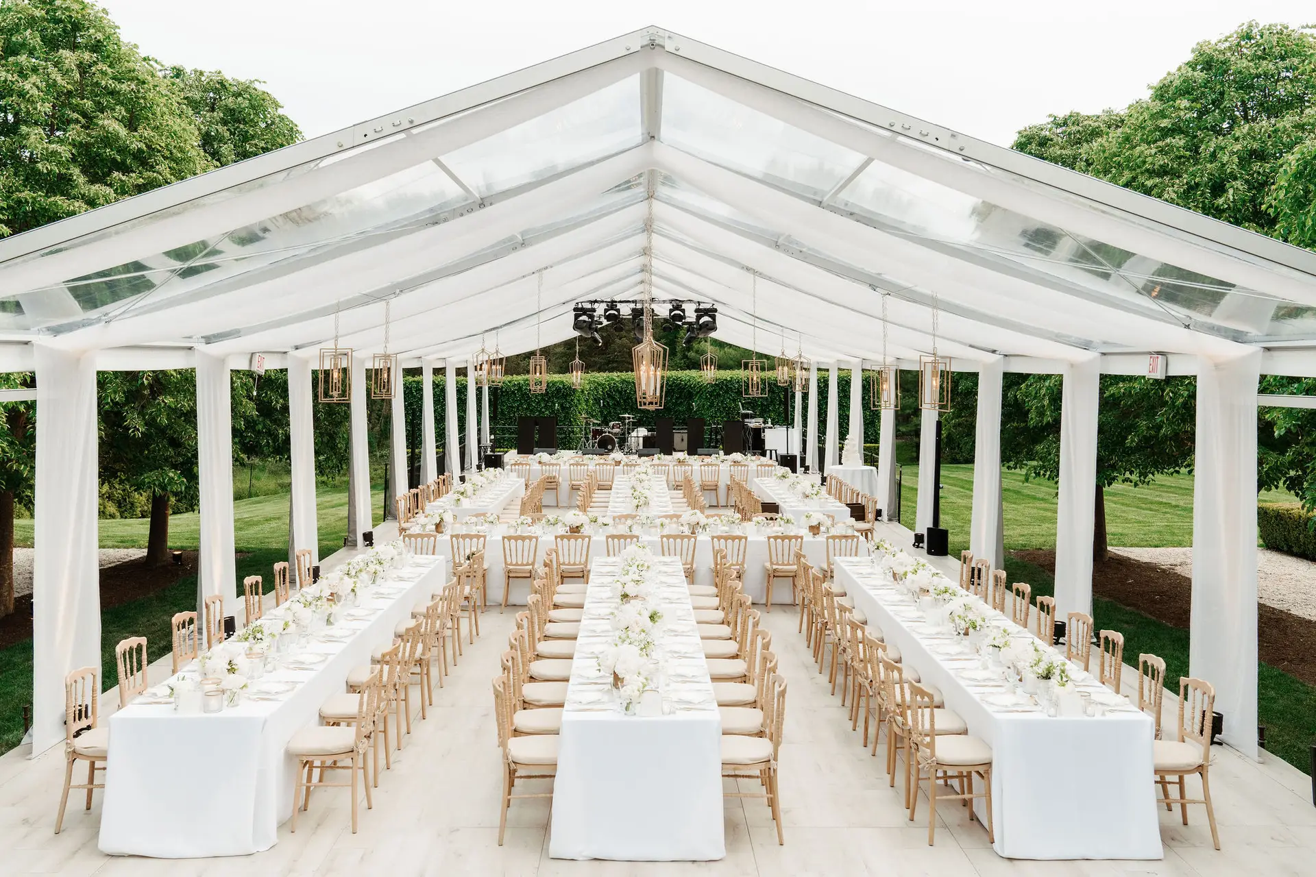 The reception space exuded sophistication with its carefully curated design and layout. Long rectangle tables were arranged to foster a more intimate dining experience, while the favorable weather allowed all sides of the tent to remain open, creating a semi al fresco ambiance complemented by light drapery framing the tent structure.