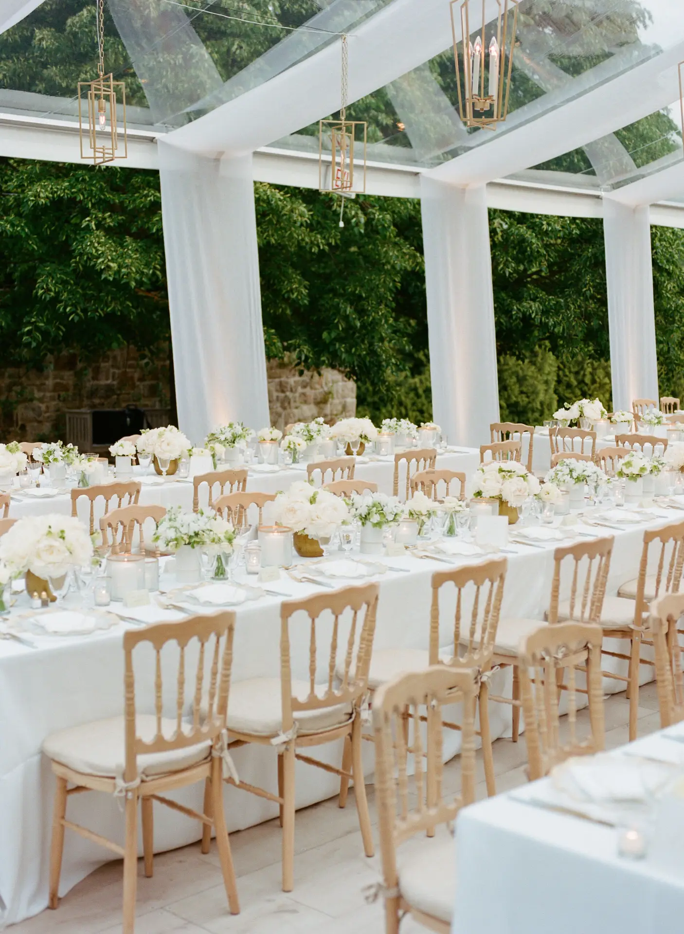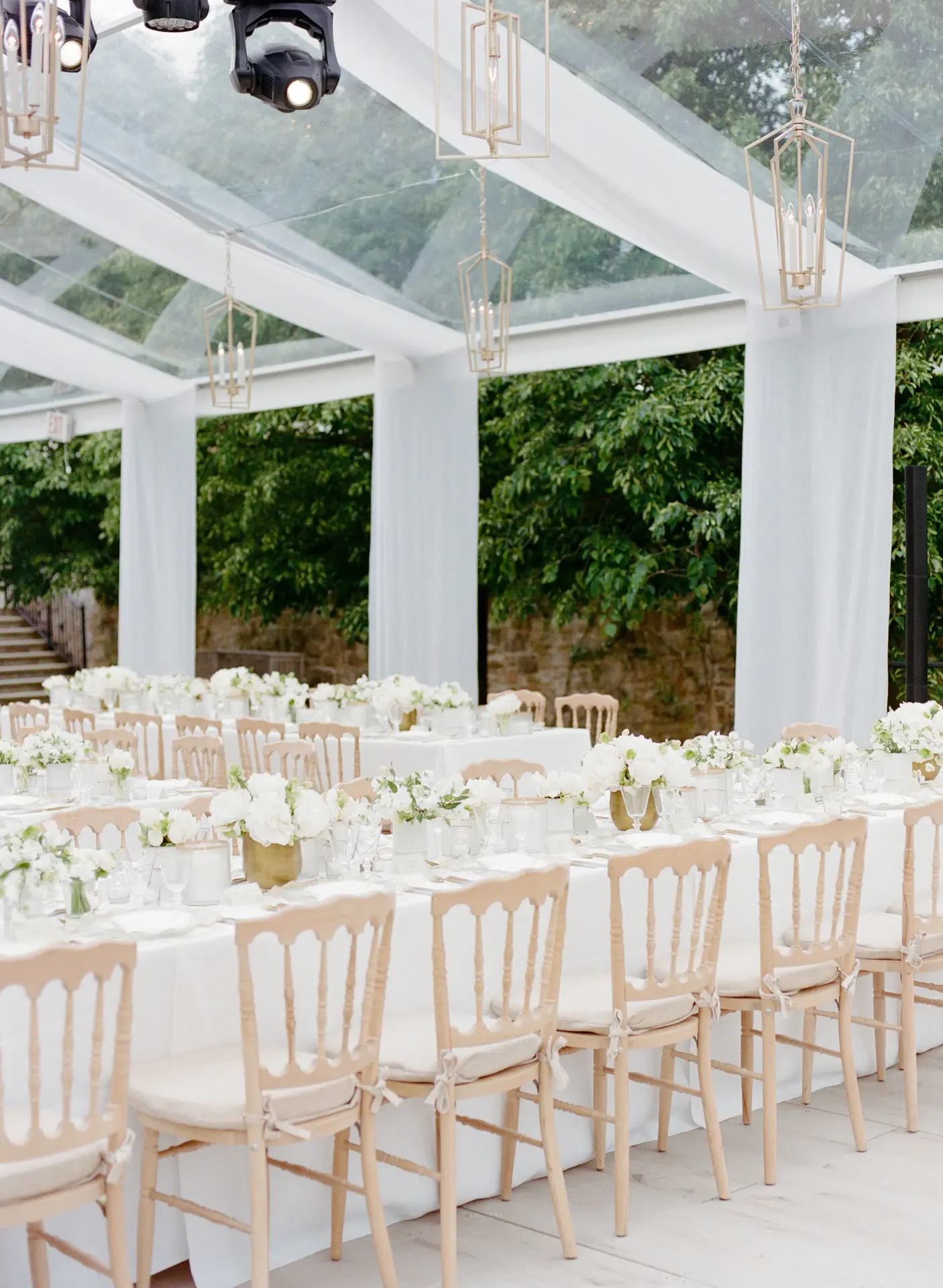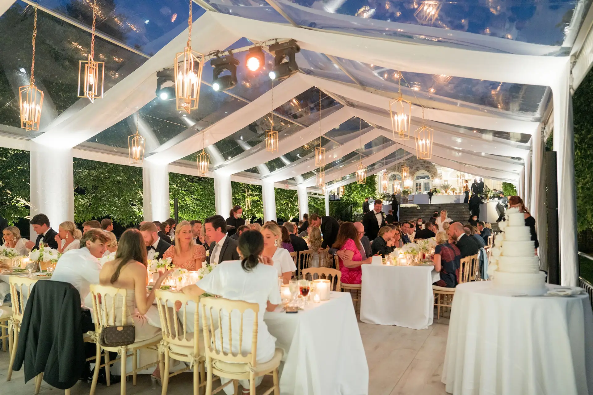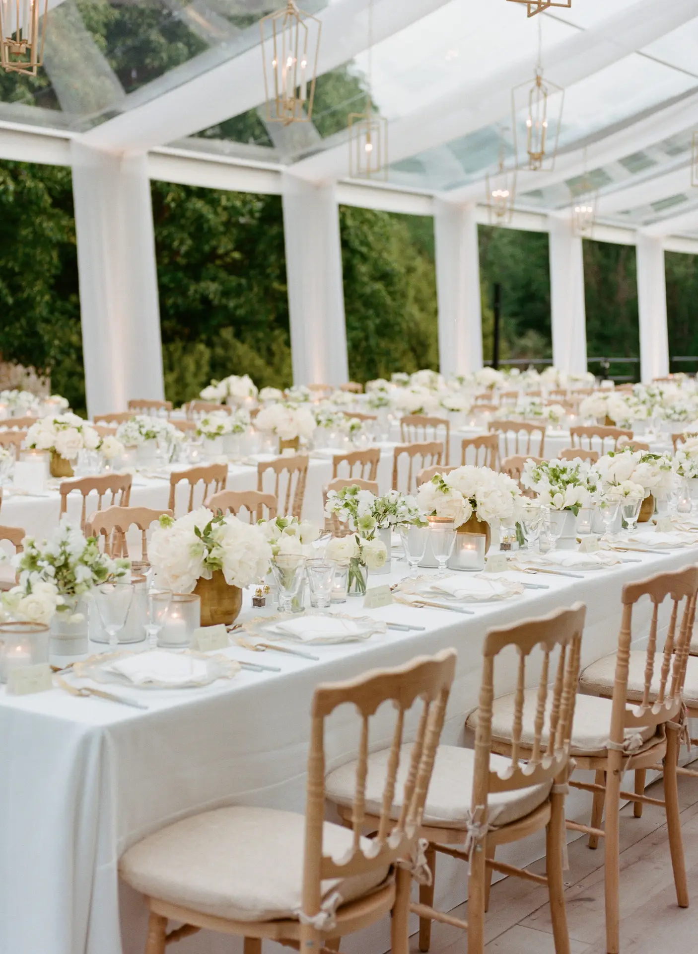 The reception space exuded sophistication with its carefully curated design and layout. Long rectangle tables were arranged to foster a more intimate dining experience, while the favorable weather allowed all sides of the tent to remain open, creating a semi al fresco ambiance complemented by light drapery framing the tent structure.