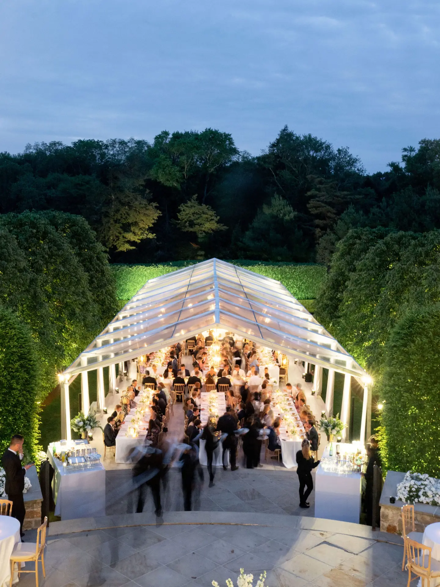As the outdoor patio area was elevated from the rest of the backyard, the Matthew Robbins team decided for ease, the Greenwich Tent team installed a raised subfloor, along with our whitewash floor finish, beneath our 40’x90′ Clearspan Losberger. This setup allowed guests to transition seamlessly from the patio area directly into the reception tent.