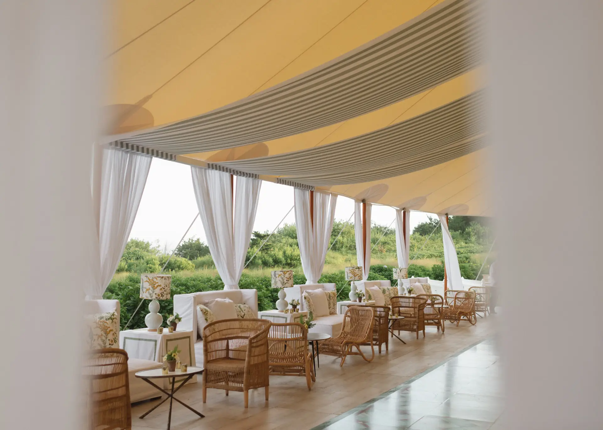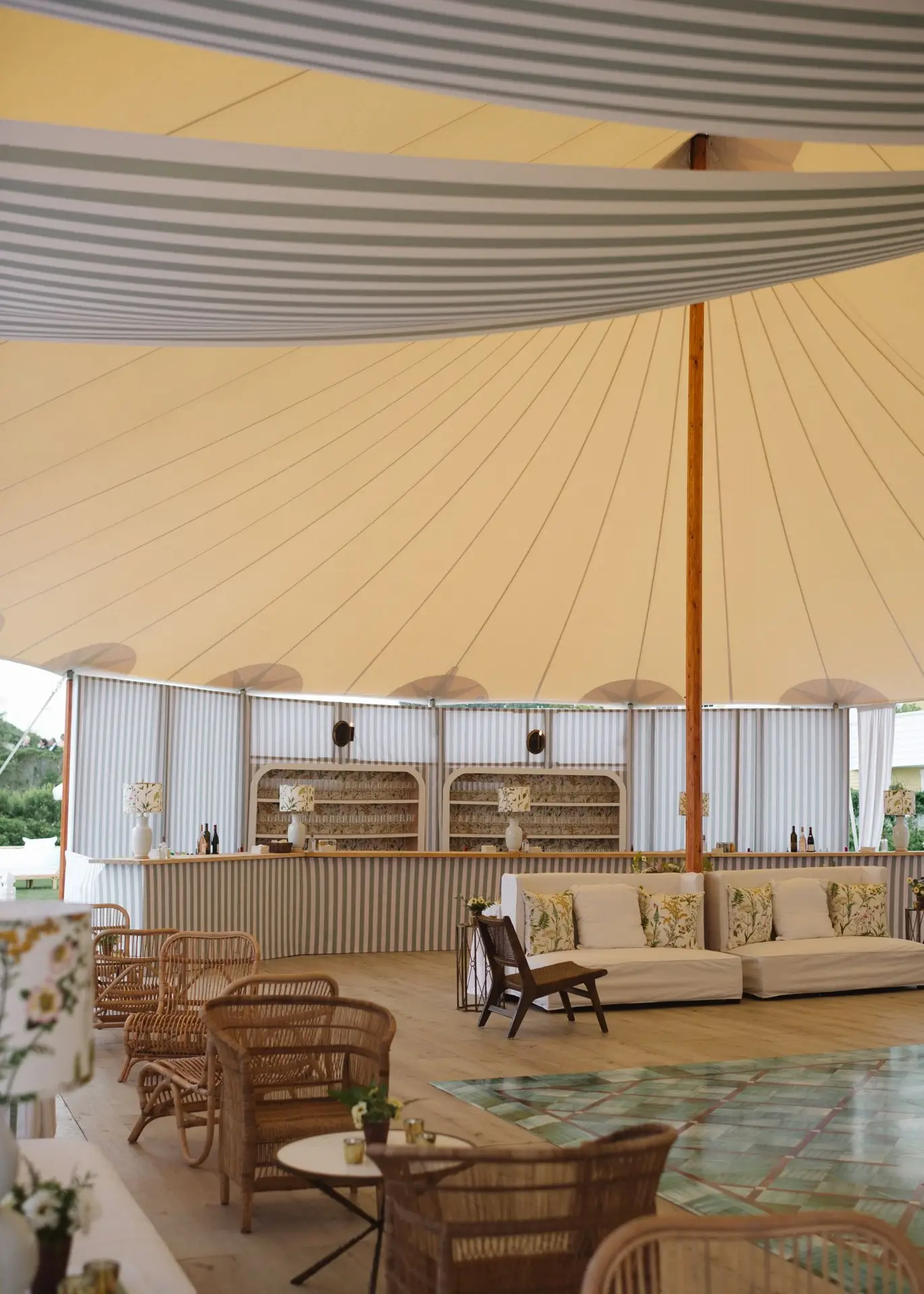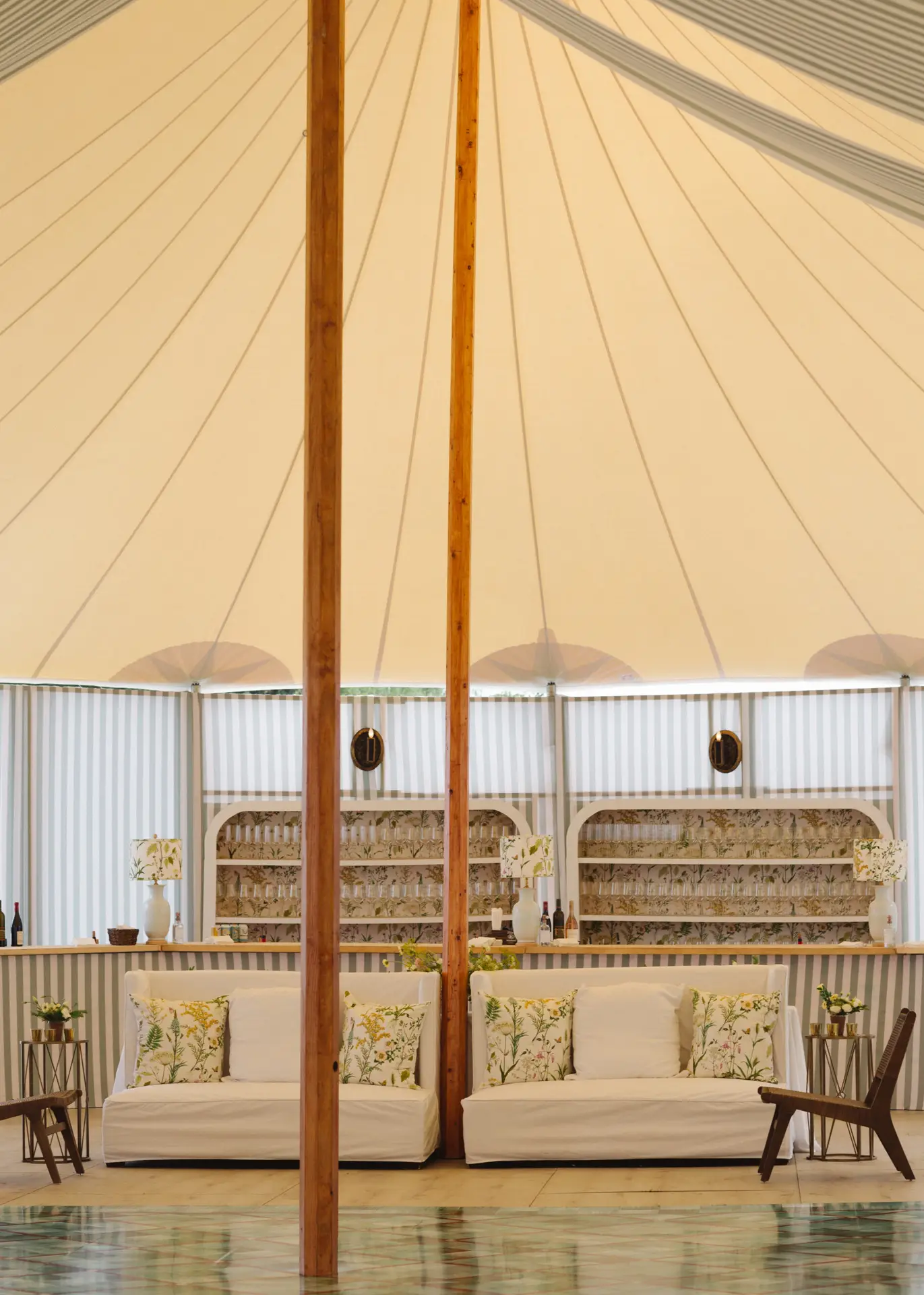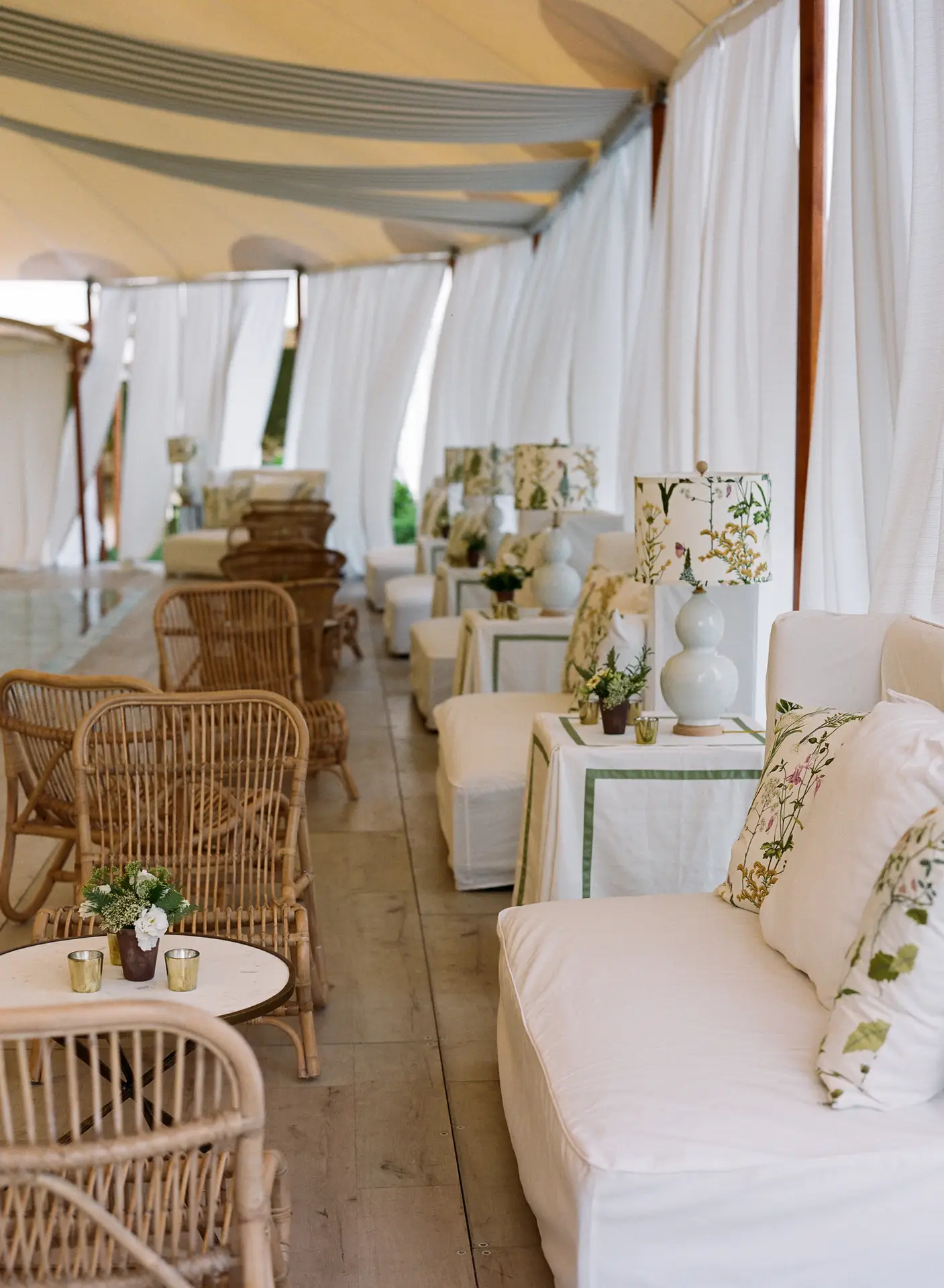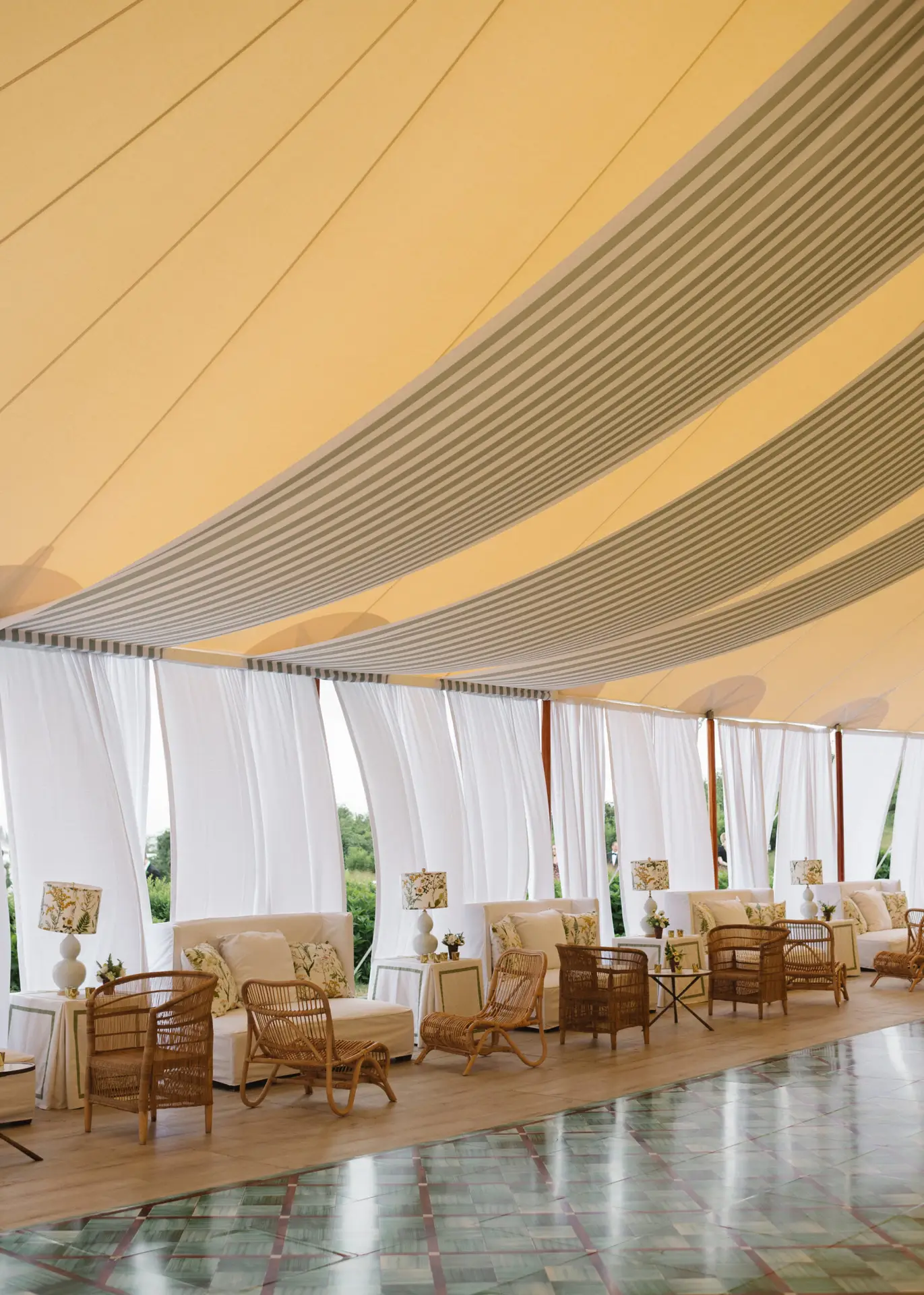 Upon entering the lounge tent through a sailcloth hallway, guests were greeted by a verdant, diamond-tiled dance floor reminiscent of the iconic La Sponda restaurant in Positano. Adjacent to the dance floor, the bar exuded elegance with its upholstery in green and white stripe cotton, complemented by sweeping fabric drapes adorning the ceiling. Throughout the space, floral lampshades and rattan furniture added touches of charm and sophistication.