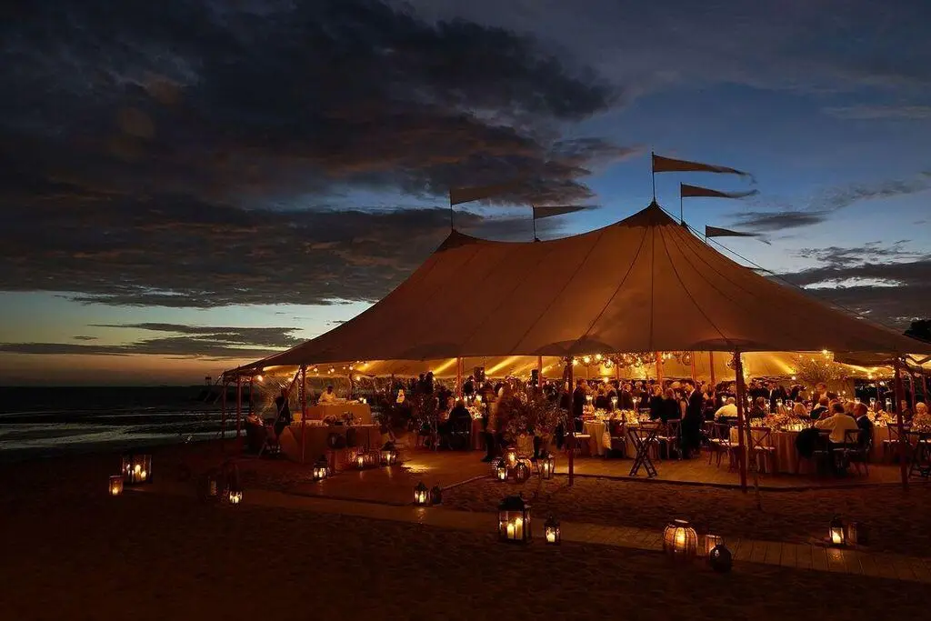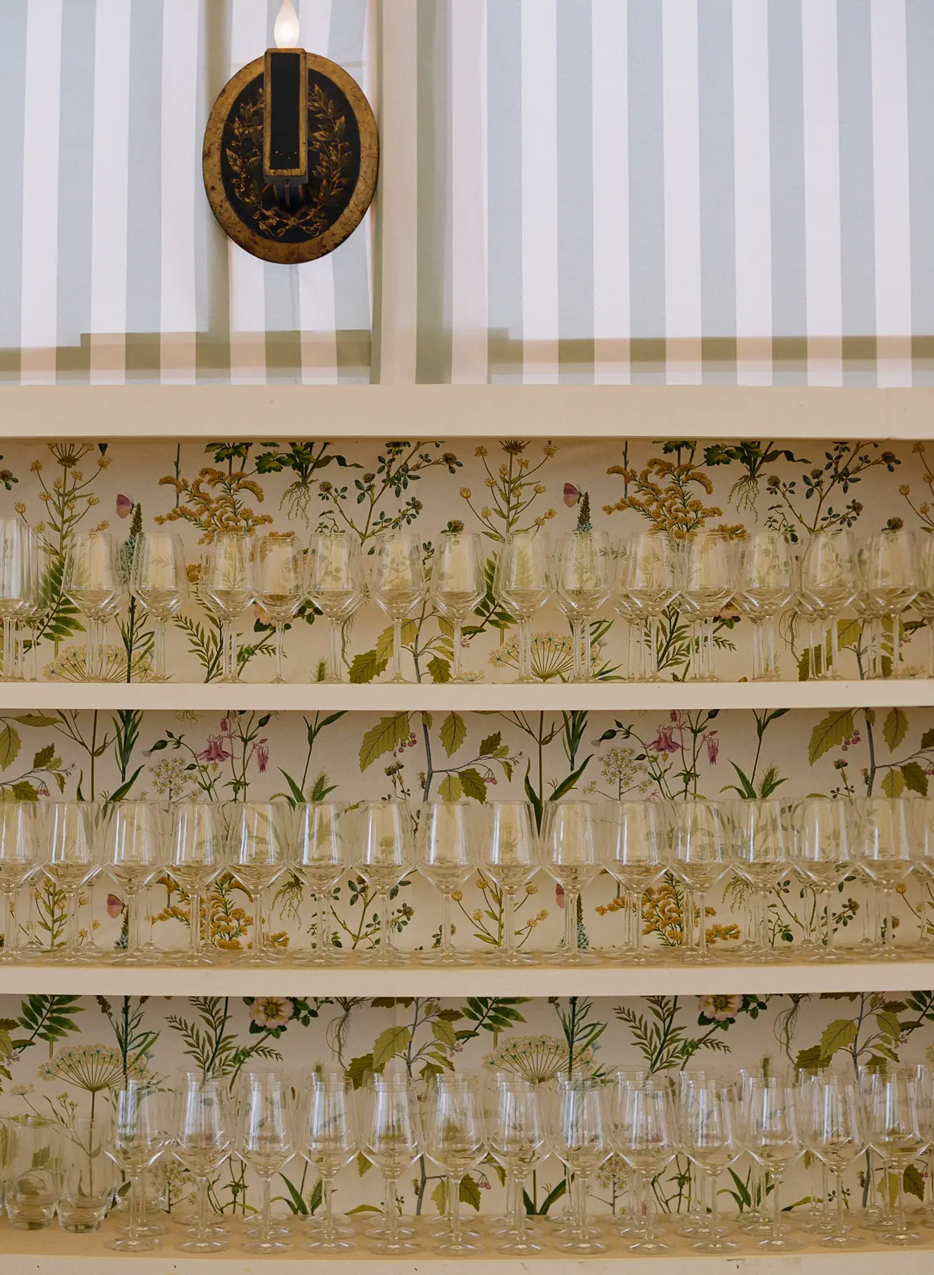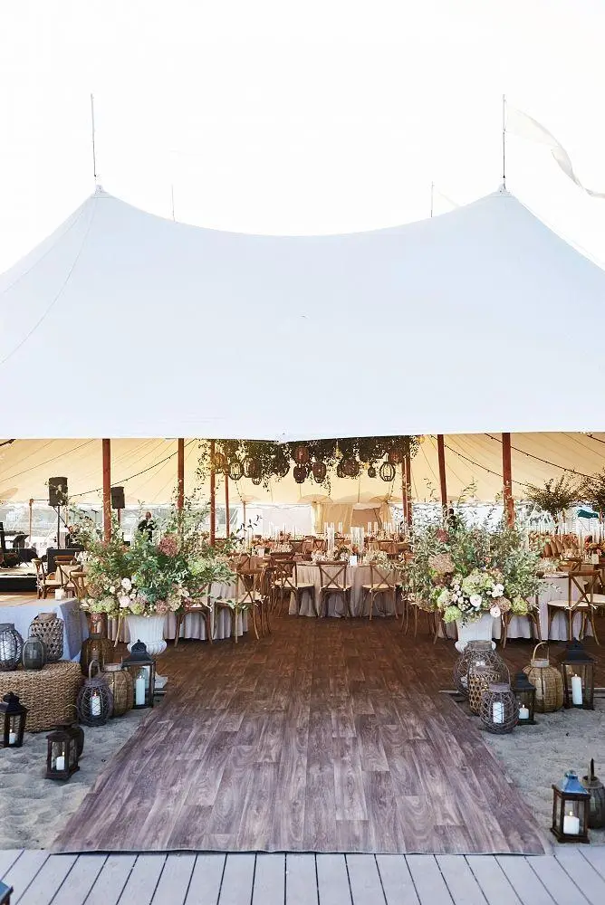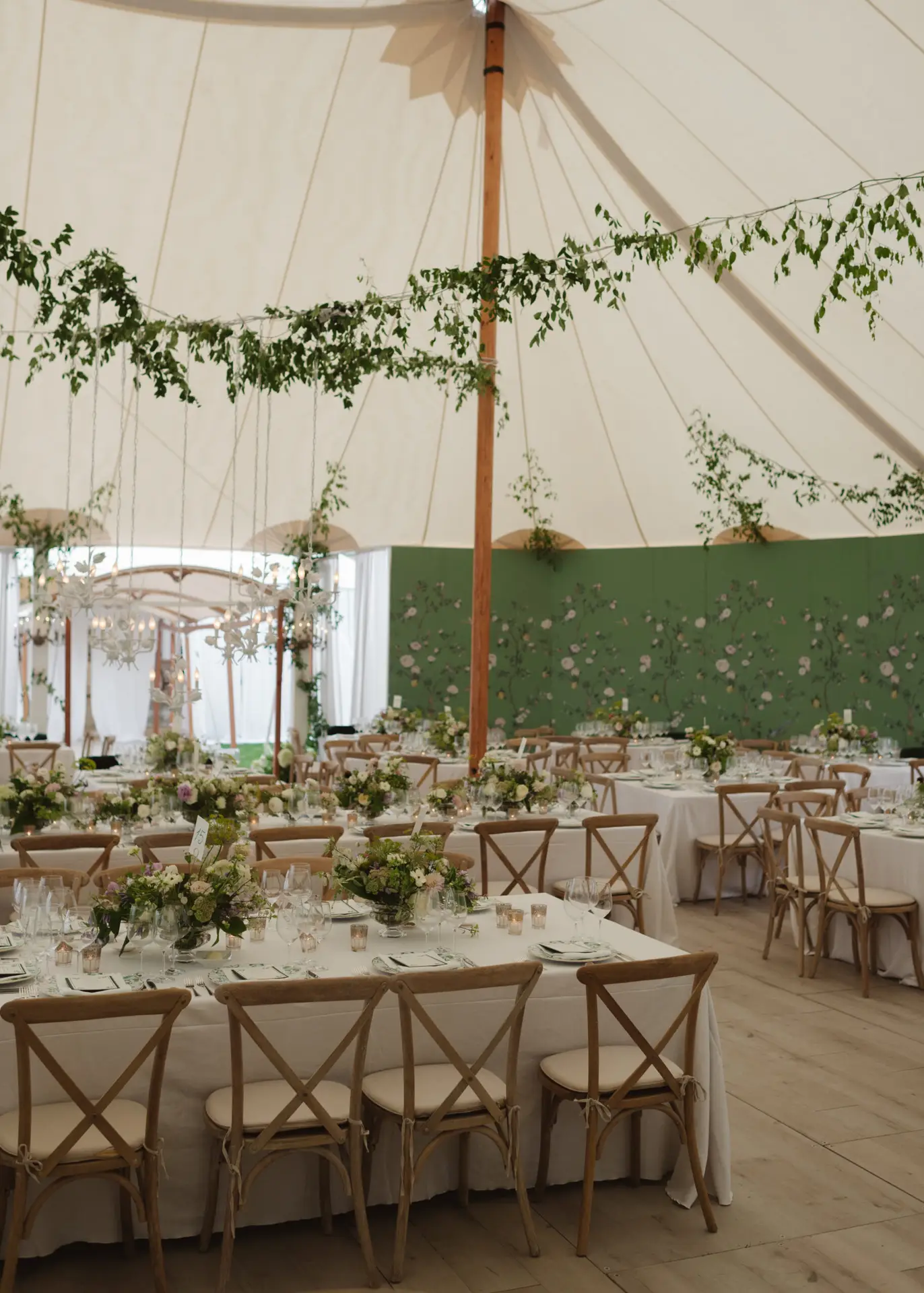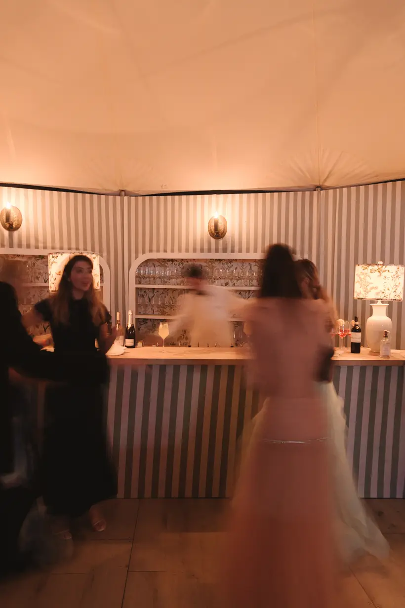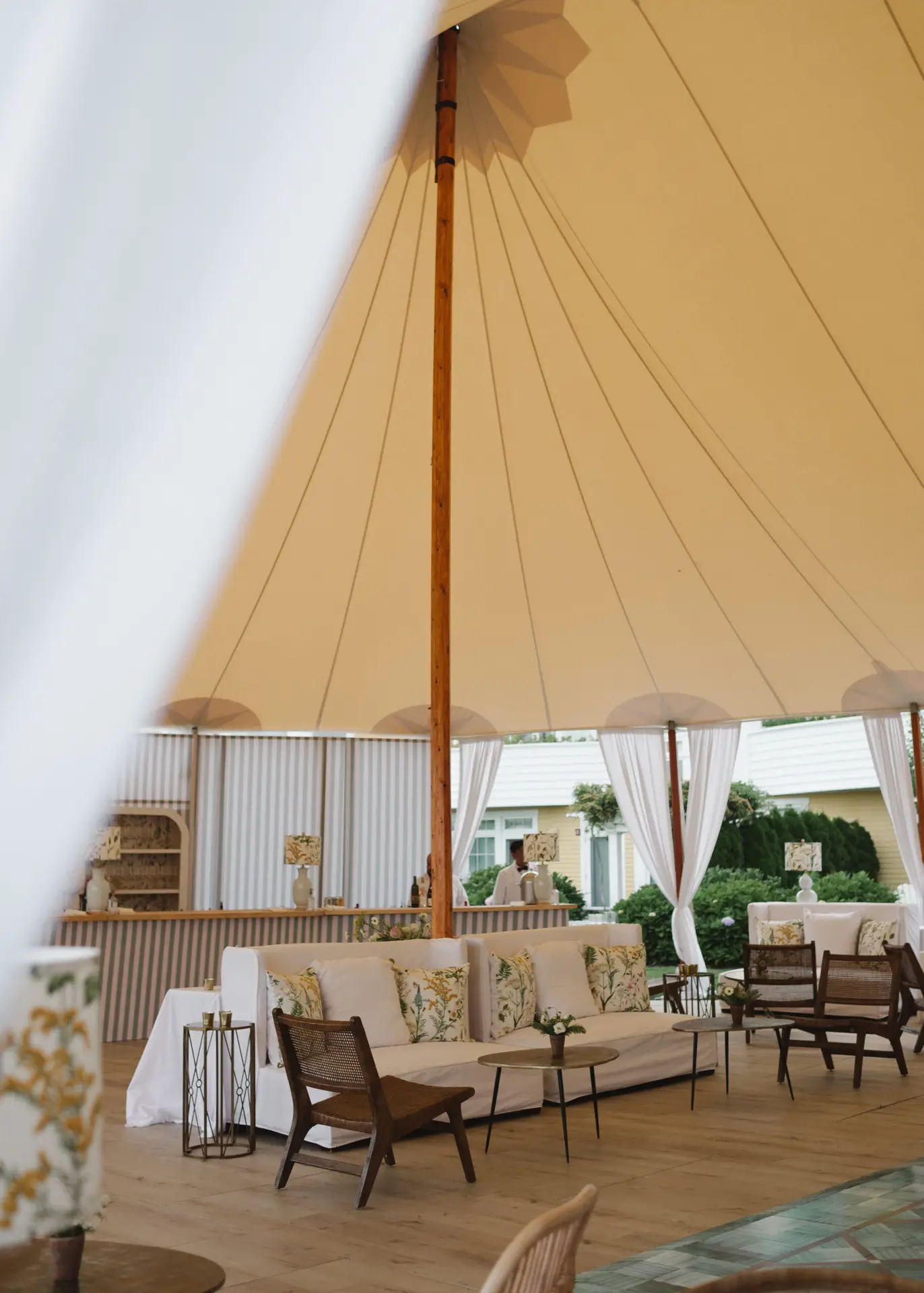 Upon entering the lounge tent through a sailcloth hallway, guests were greeted by a verdant, diamond-tiled dance floor reminiscent of the iconic La Sponda restaurant in Positano. Adjacent to the dance floor, the bar exuded elegance with its upholstery in green and white stripe cotton, complemented by sweeping fabric drapes adorning the ceiling. Throughout the space, floral lampshades and rattan furniture added touches of charm and sophistication.