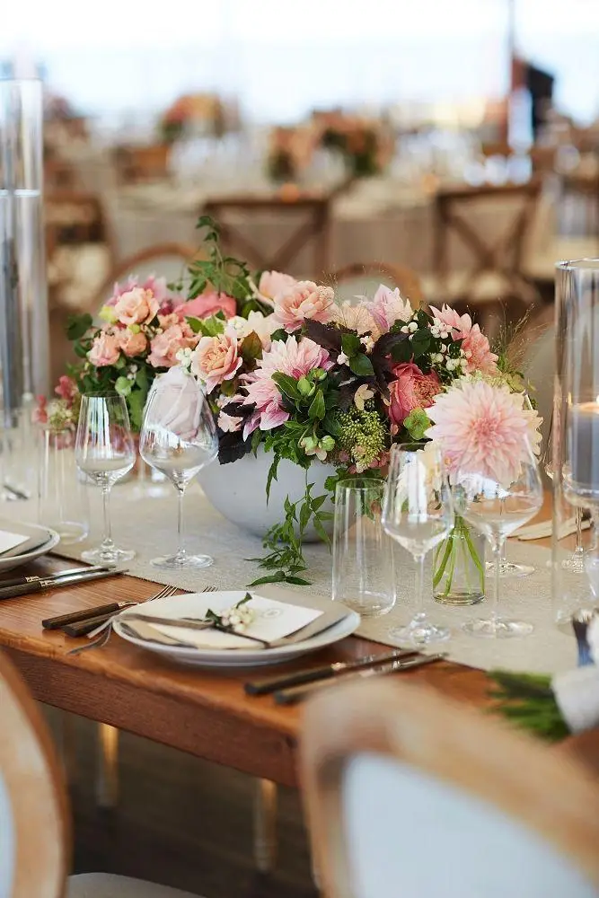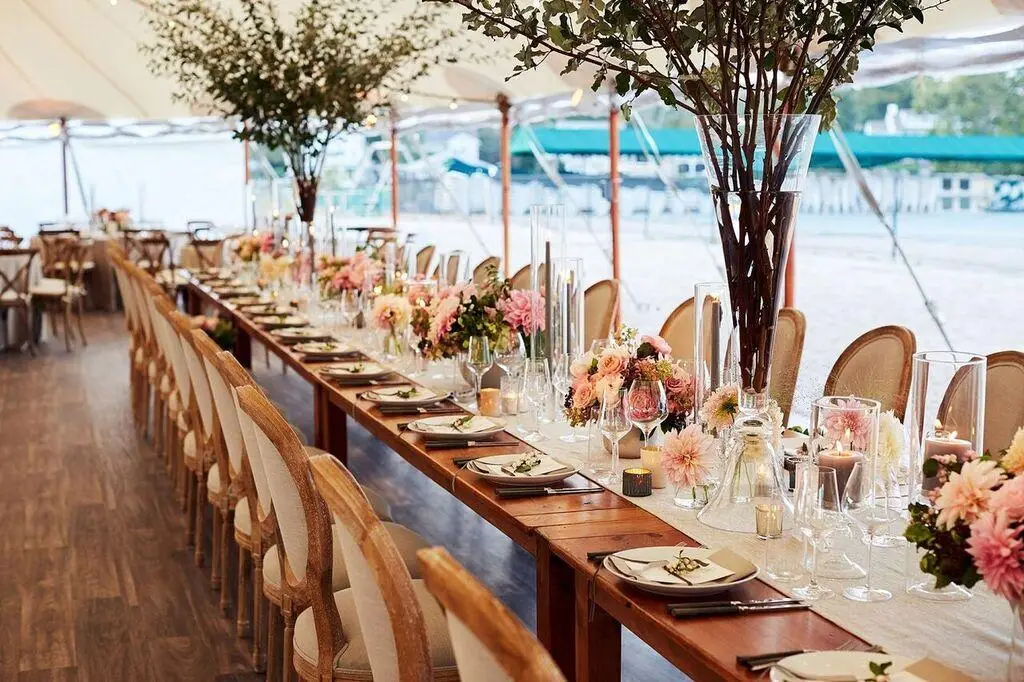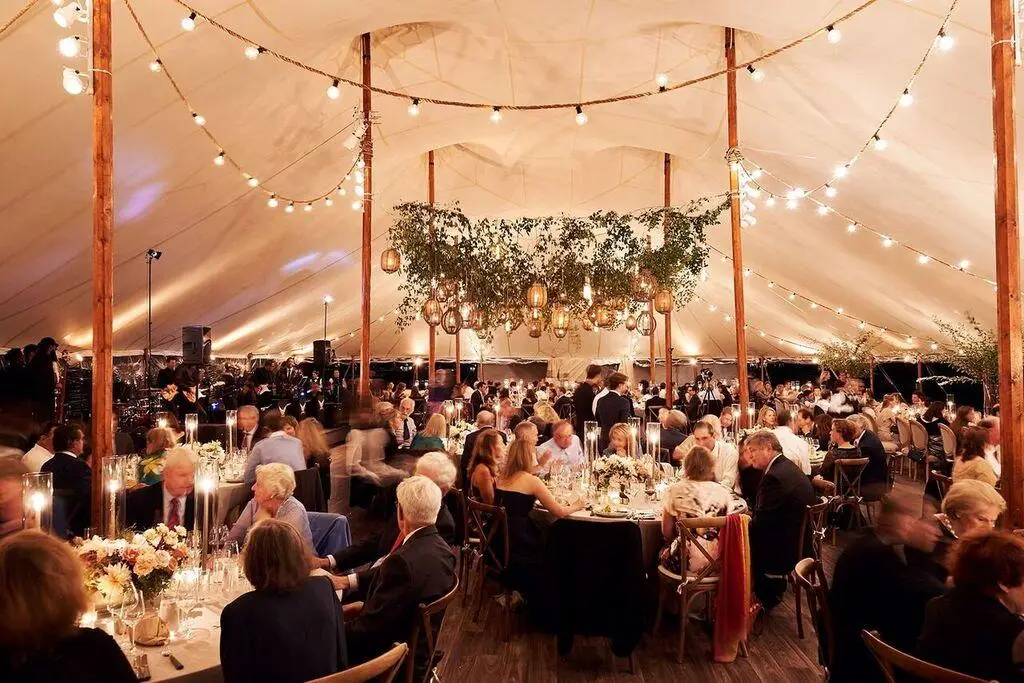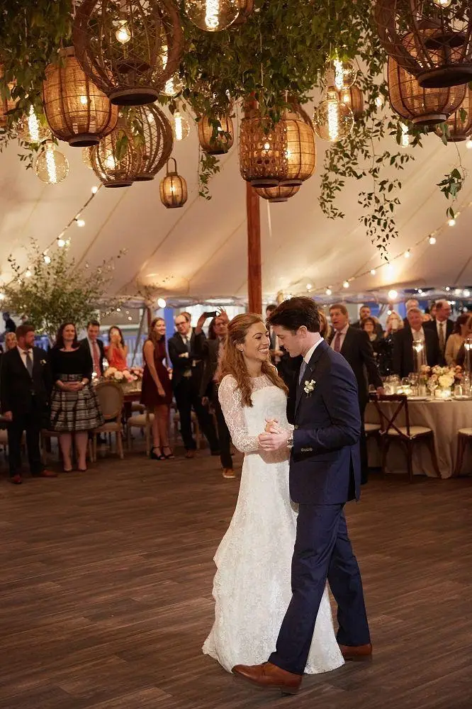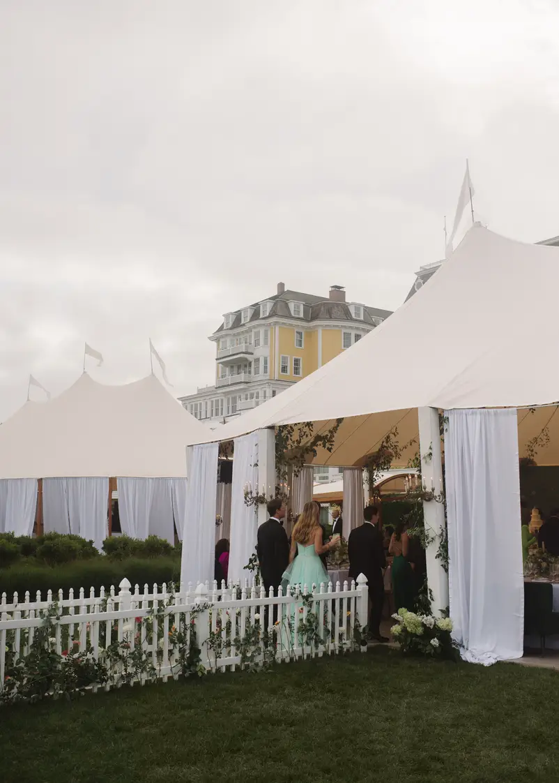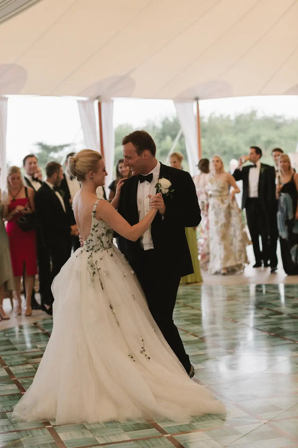 Following cocktail hour featuring Rhode Island oysters, guests were ushered into the tent for dinner and the reception. Katherine fondly recalls the intimate atmosphere created by Tara Guérard and her team, seamlessly blending indoor and outdoor elements. The space was adorned with painted wall panels inspired by Katherine’s beloved de Gournay pattern, complemented by creeping vines and toile chandeliers suspended from the ceiling. Tables were adorned with Ginori china and low centerpieces, completing the enchanting ambiance creating the ideal “late-summer simple” aesthetic.