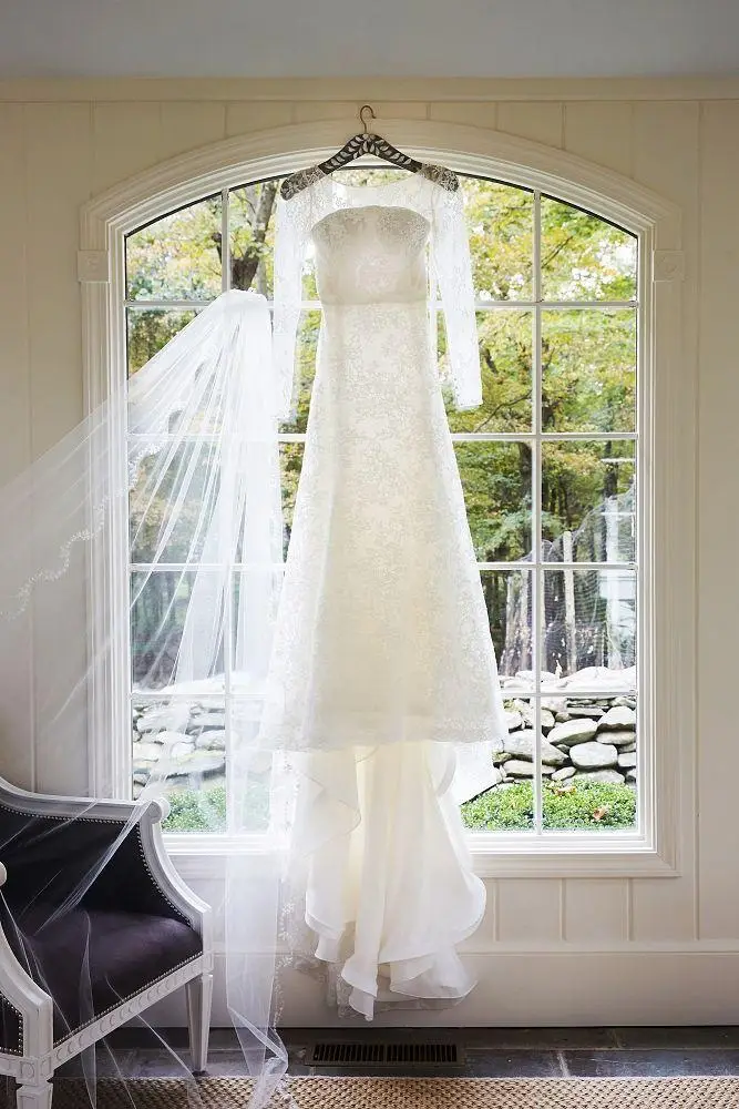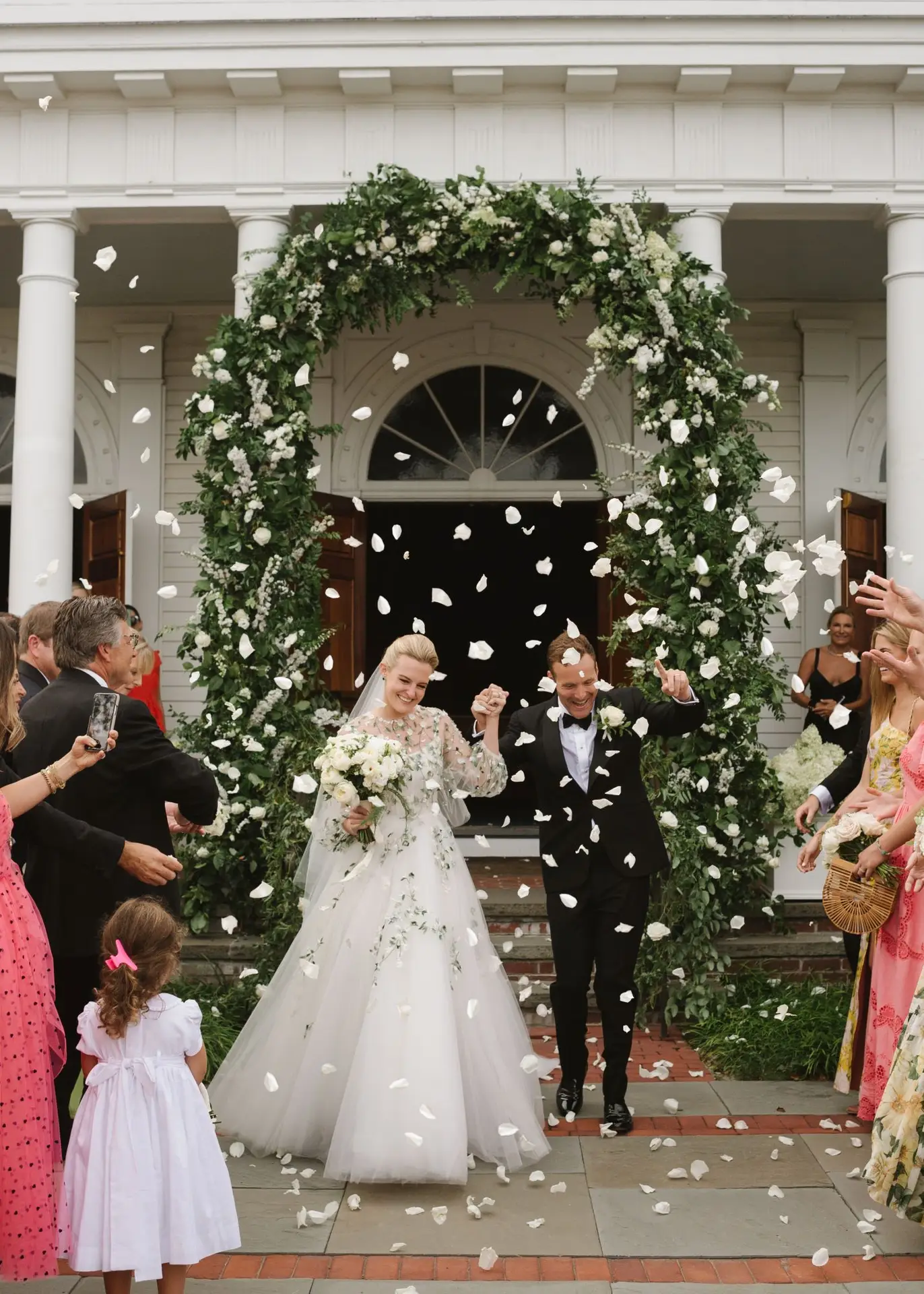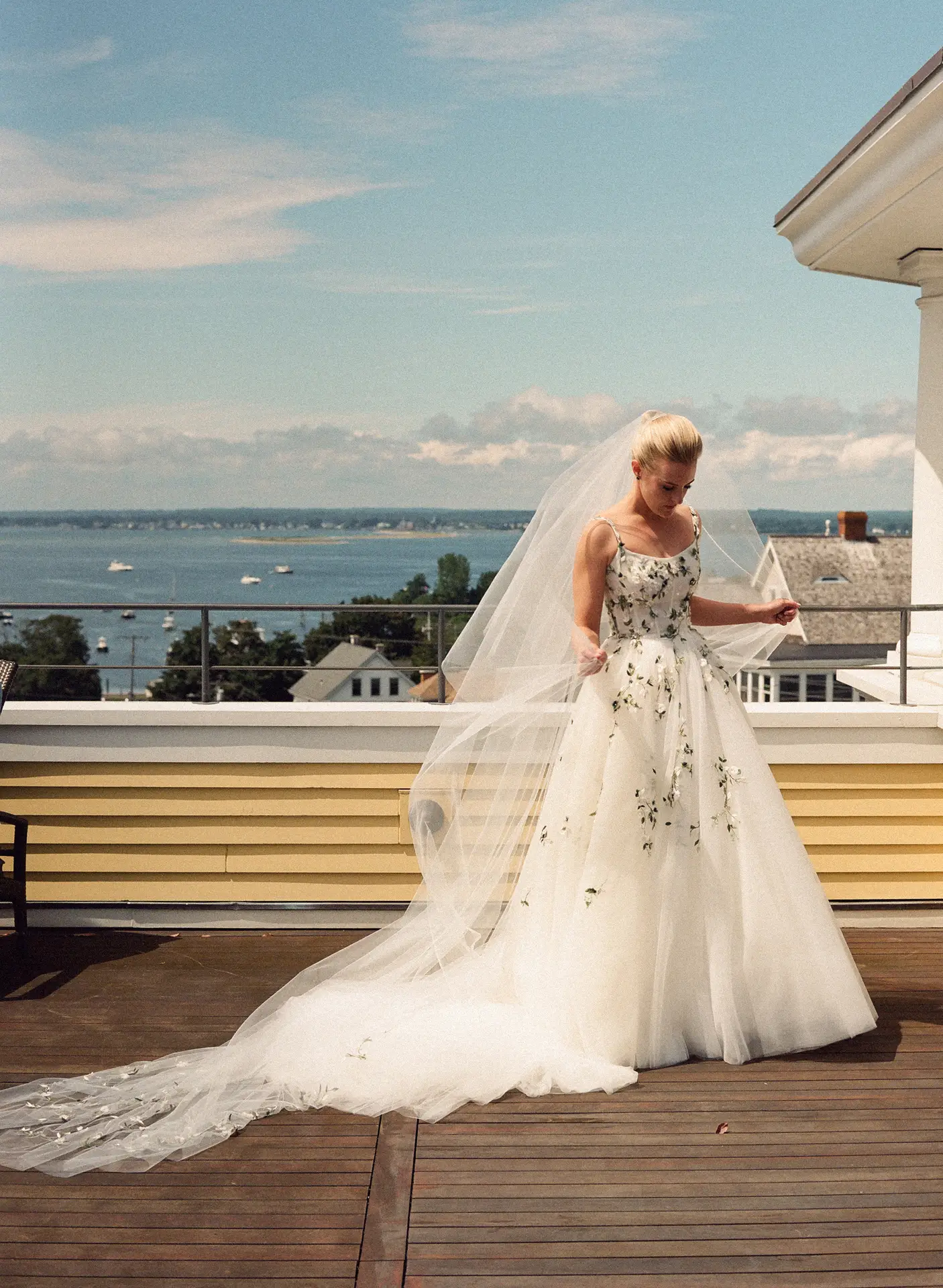 Katherine’s wedding ensemble, including her dress and veil, sourced from Monique Lhuillier. The gown featured multiple layers of luminous white tulle adorned with delicate green and white beaded flowers. Originally designed as a high-low strapless gown, the Monique Lhuillier team undertook a complete customization. Talk about a showstopper!