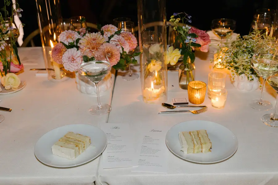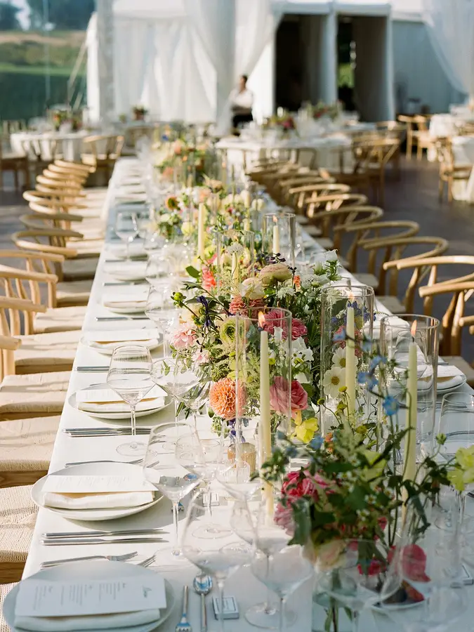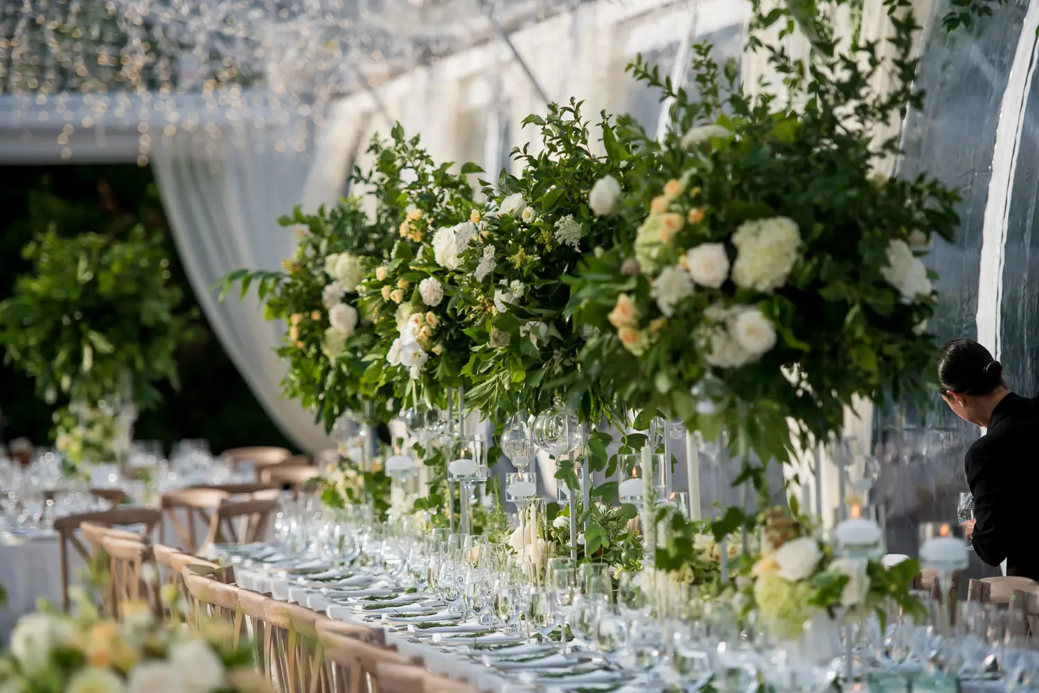 The intricately crafted centerpieces by Hana Floral infused the space with vibrant colors, textures, and lush greenery, perfectly complementing the floral chandeliers above. The soft glow of pale yellow candles added a cozy, summery ambiance as the sun started to dip below the horizon, completing the enchanting atmosphere.